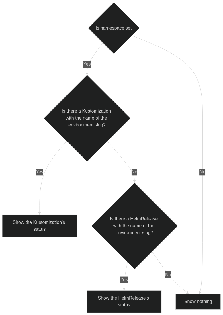 Use the environment slug as the expected name for the Flux resource. The Flux resource can be a Kustomization or a HelmRelease. Kustomization having a preference if both exist.