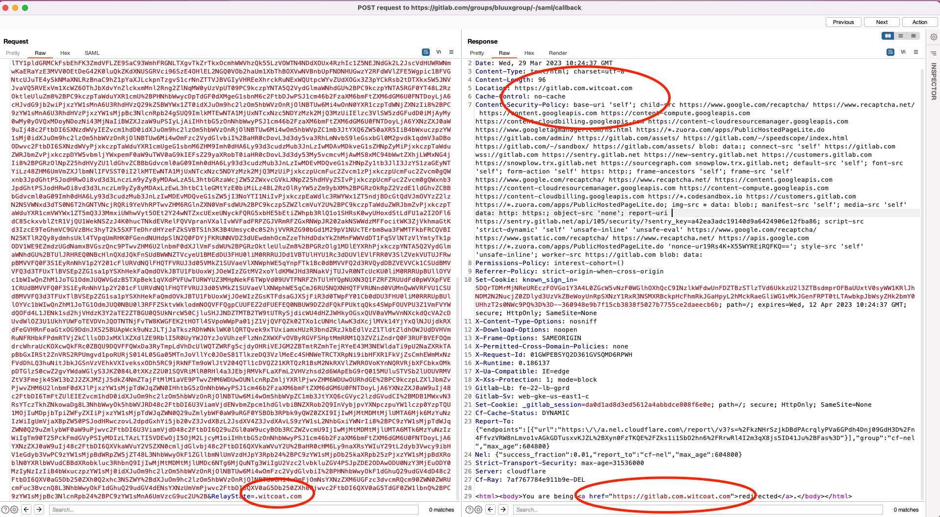 - there is open redirect while loggin to gitlab Via SAML, while the Open redirect is not much impactful since it is a post based request coming from third party domain, but the redirect happens and is also saved along in the gitlab cookies while being redirect and next time user visits