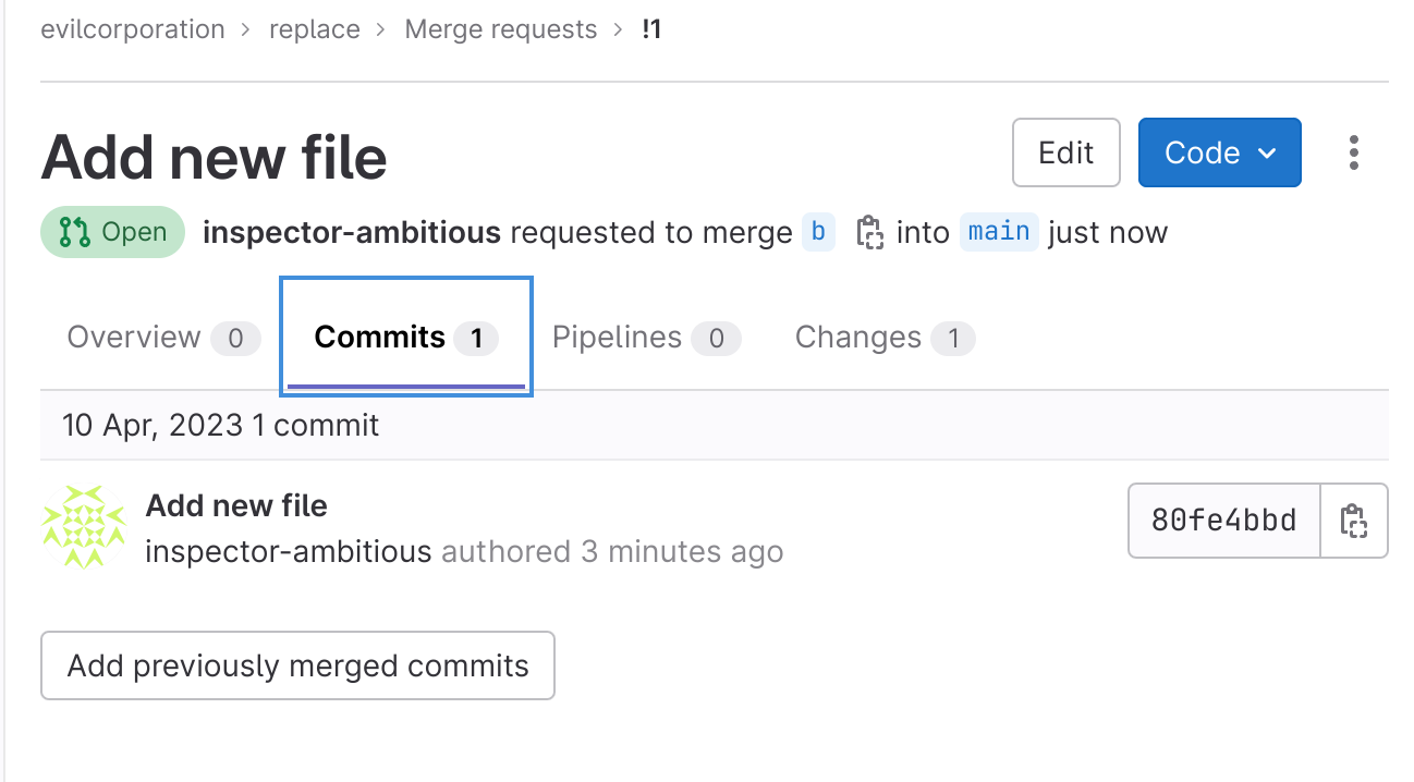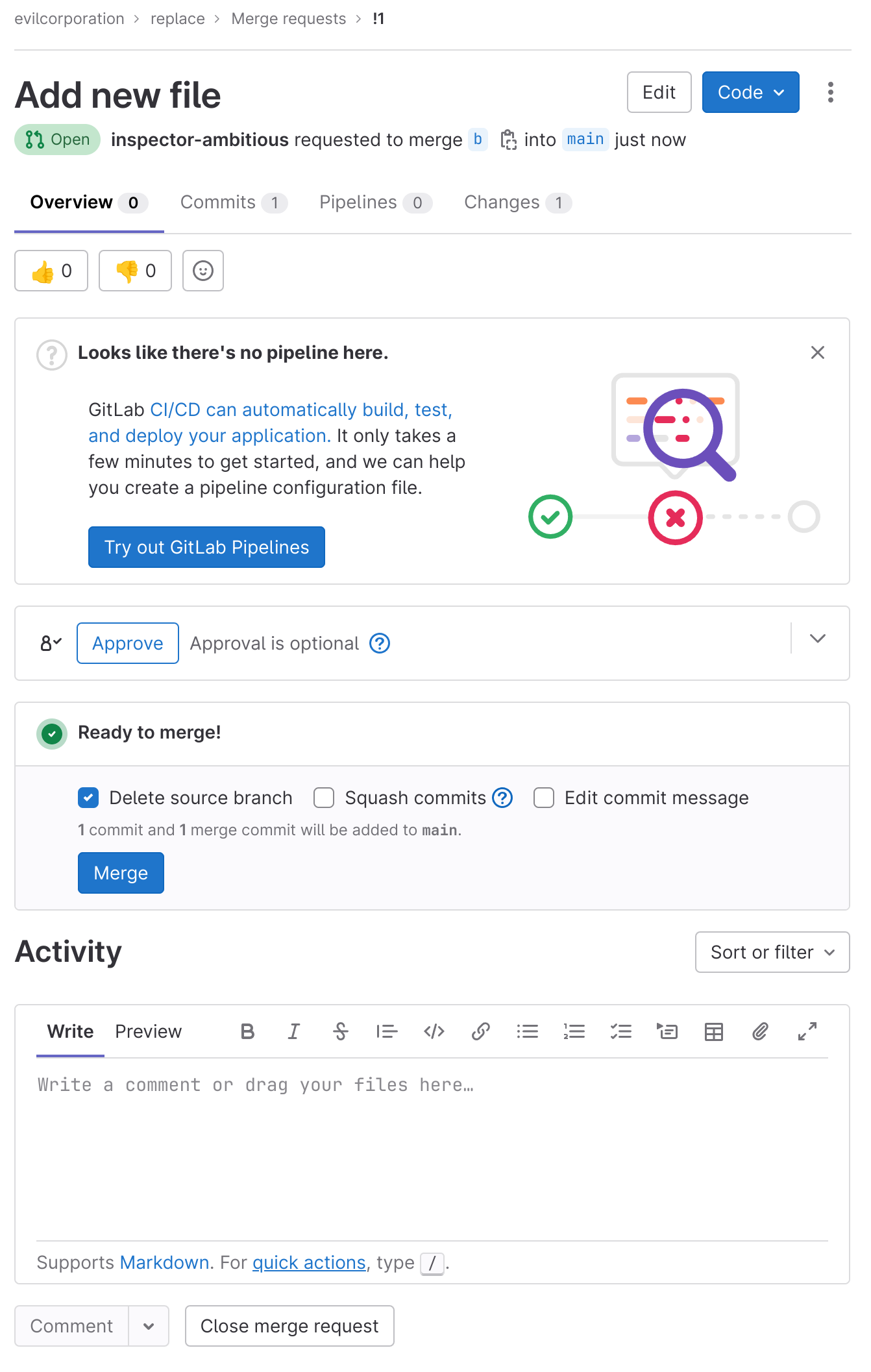 A collaborator can bypass branch protection and smuggle malicious content in a merge request, which could potentially introduce security vulnerabilities or other types of defects into the codebase, compromising the integrity and security of the repository. This could result in sensitive data being leaked, unauthorized access to resources, or even complete system compromise.