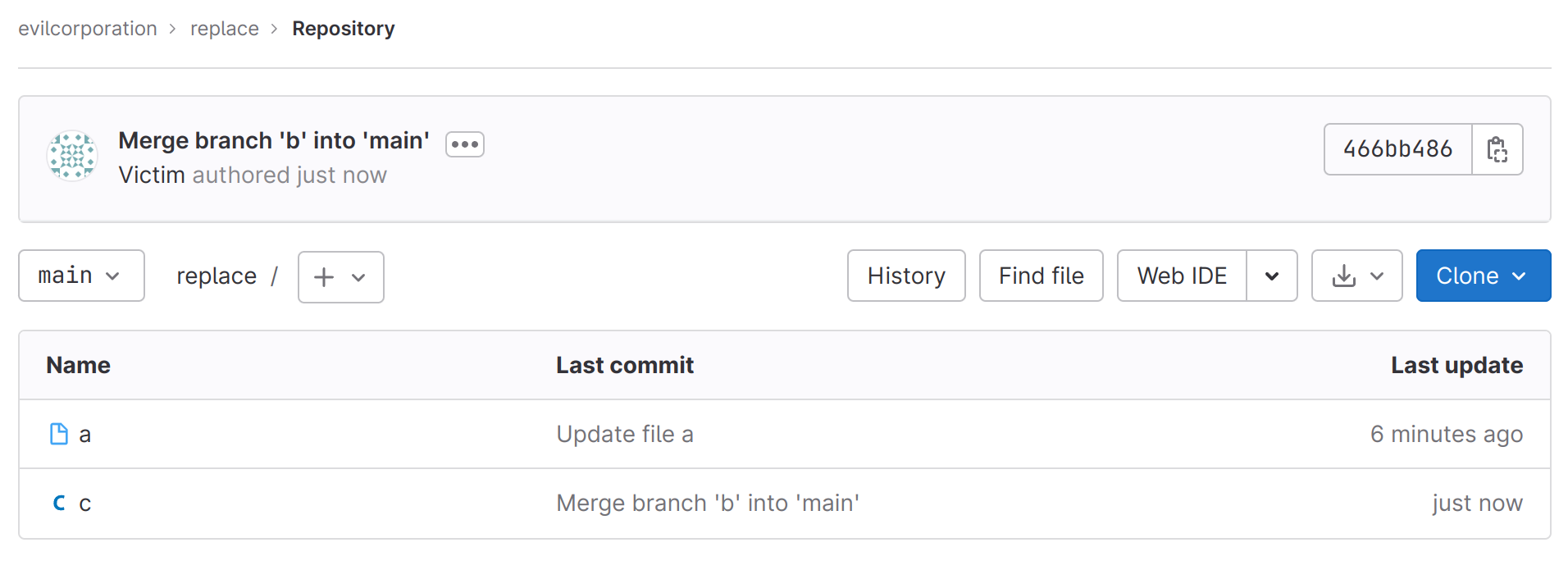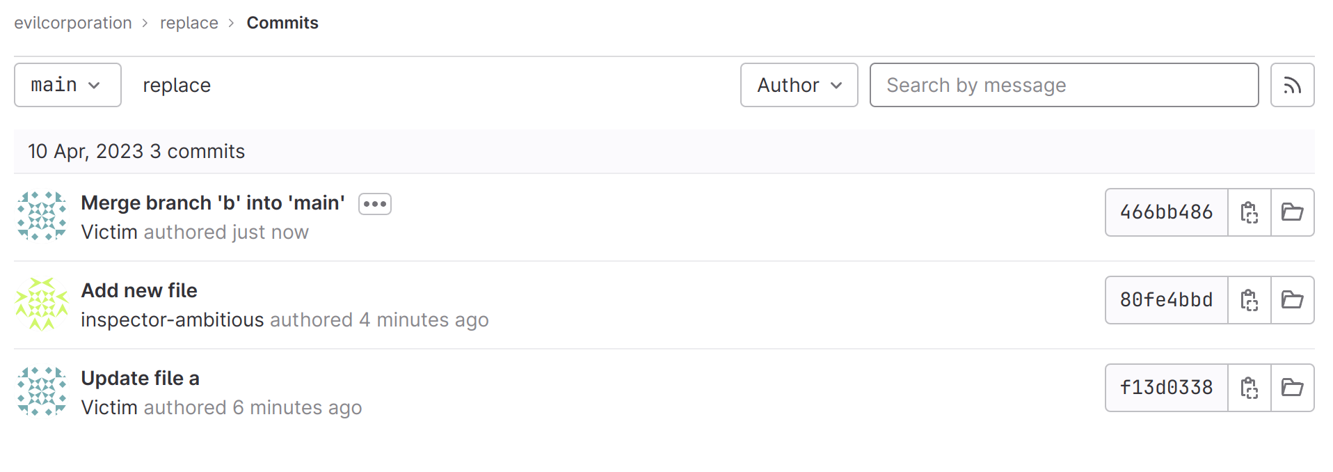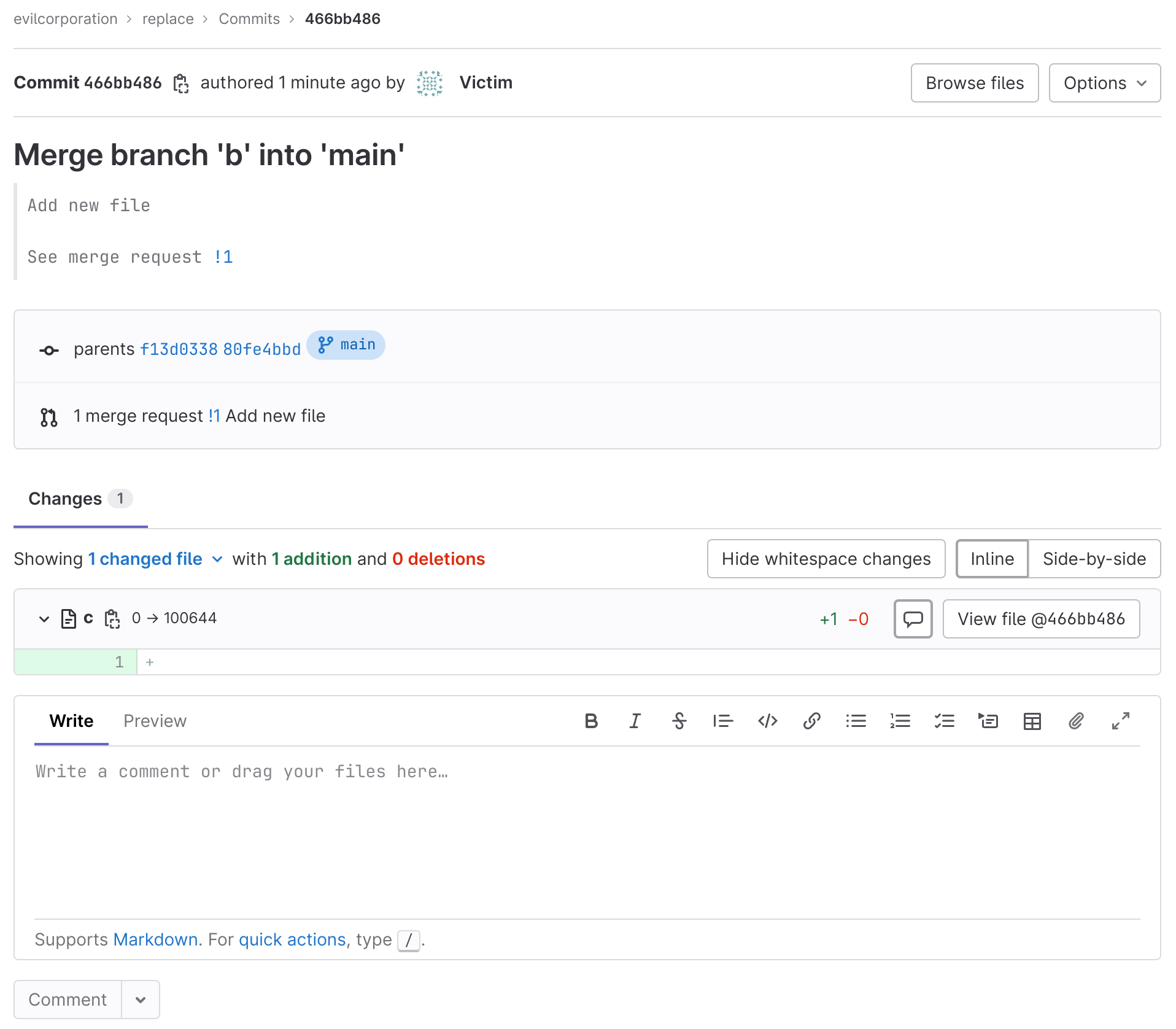 However, an attacker with the Developer role in a repository can push a replacement reference in the refs/replace namespace, which would replace an existing commit with a malicious one. And if the head commit of a MR is replaced with a malicious one, we will get a situation where the MR will show the original commit but what would be merged will be the malicious one instead. Therefore this would allow an attacker to inject malicious code in the protected branch.