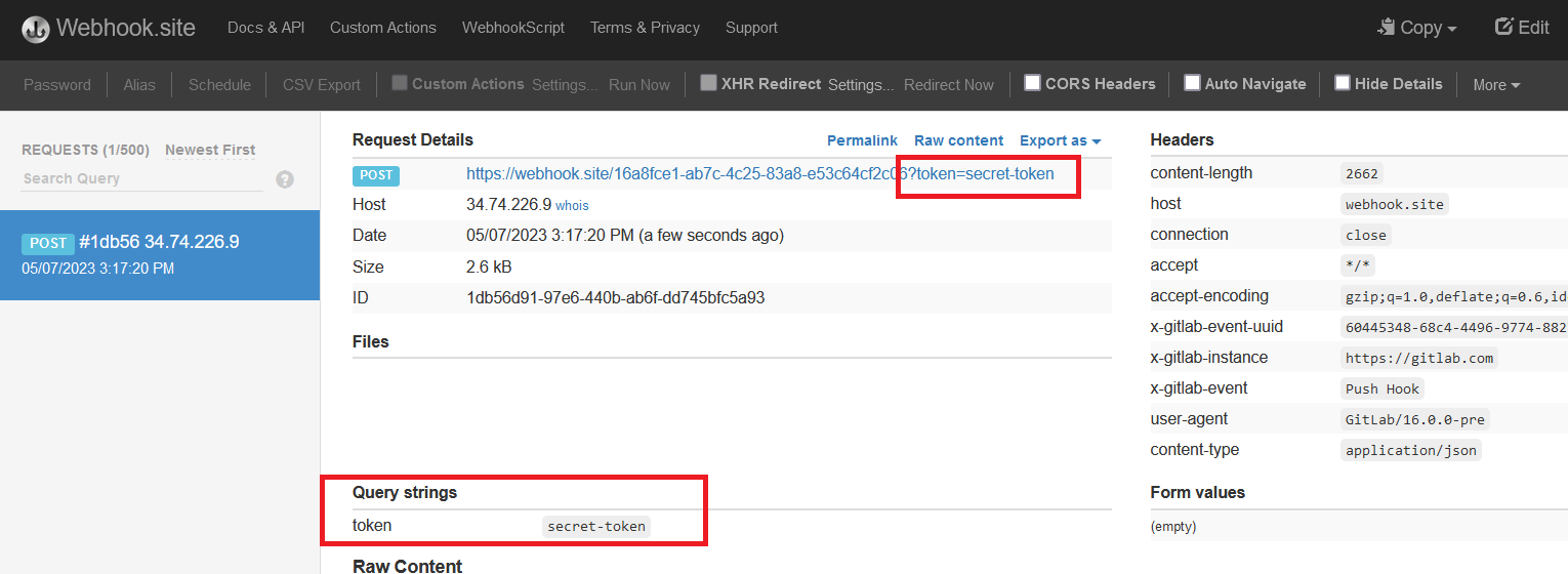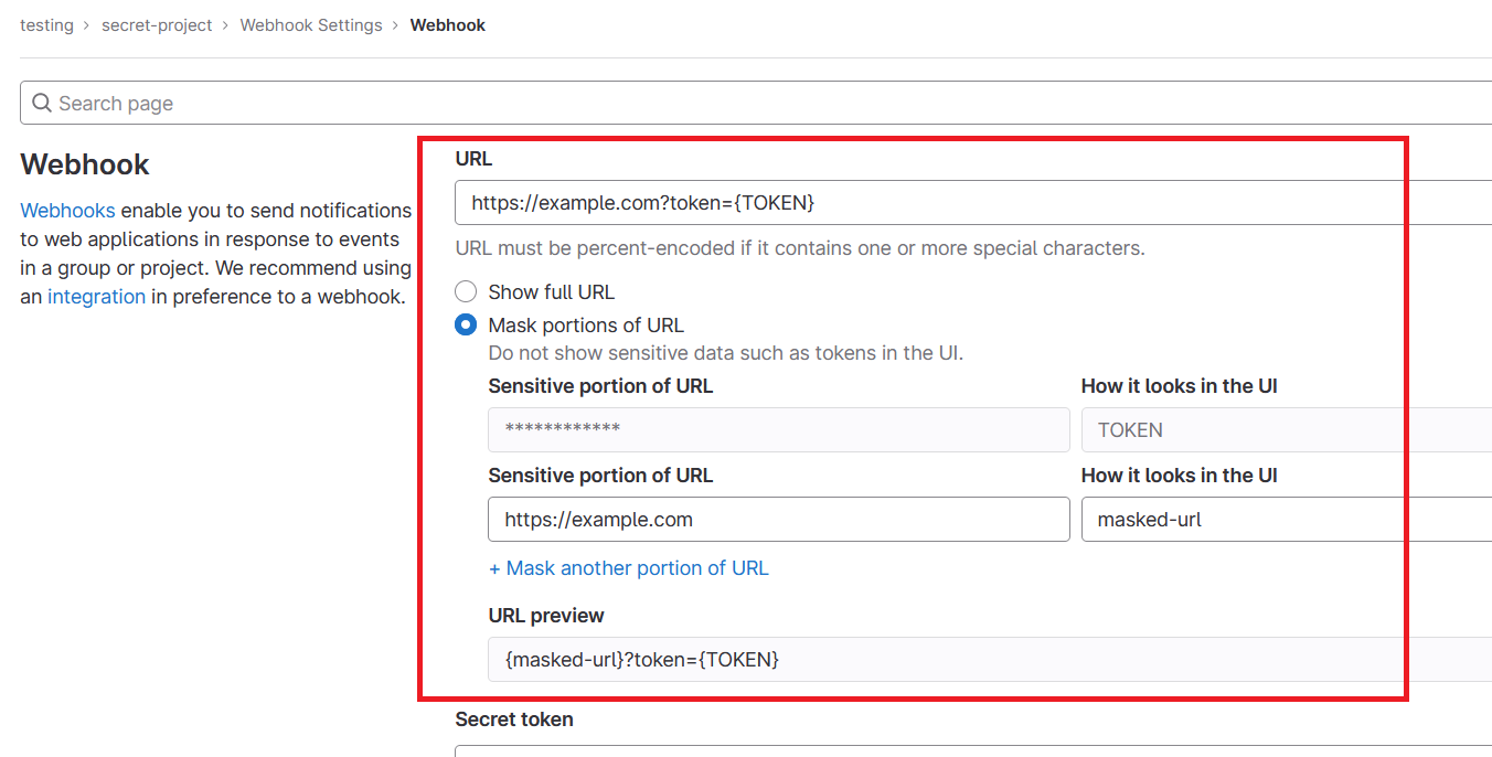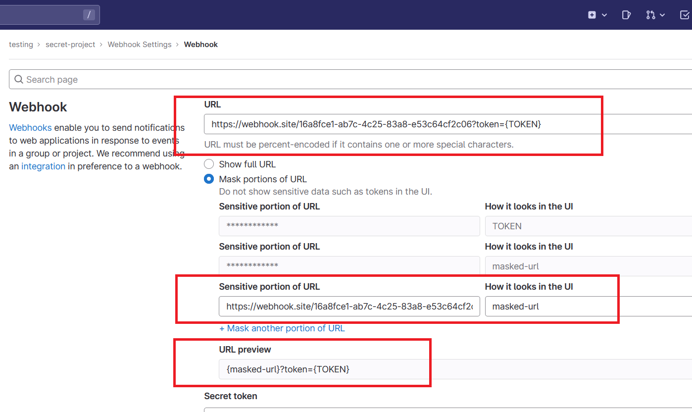 victimconfigures a webhook with a secret token and mask the secret token. For example, Put the URL like thishttps://example.com?token=secret-token - Click to add a mask, add the value