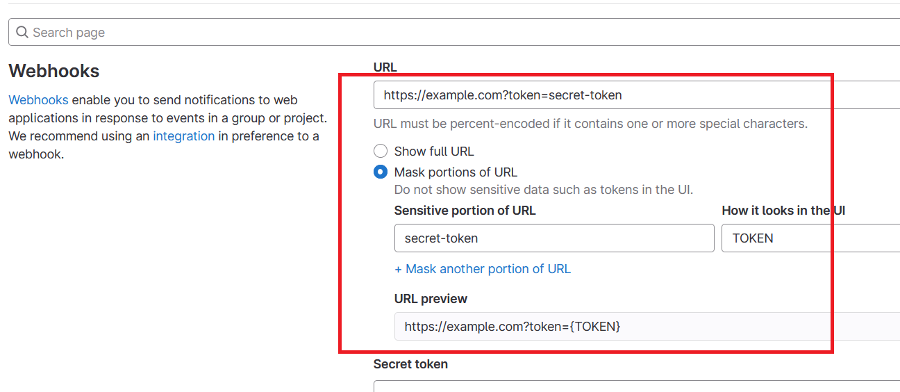 https://docs.gitlab.com/ee/user/project/integrations/webhooks.html#mask-sensitive-portions-of-webhook-urls