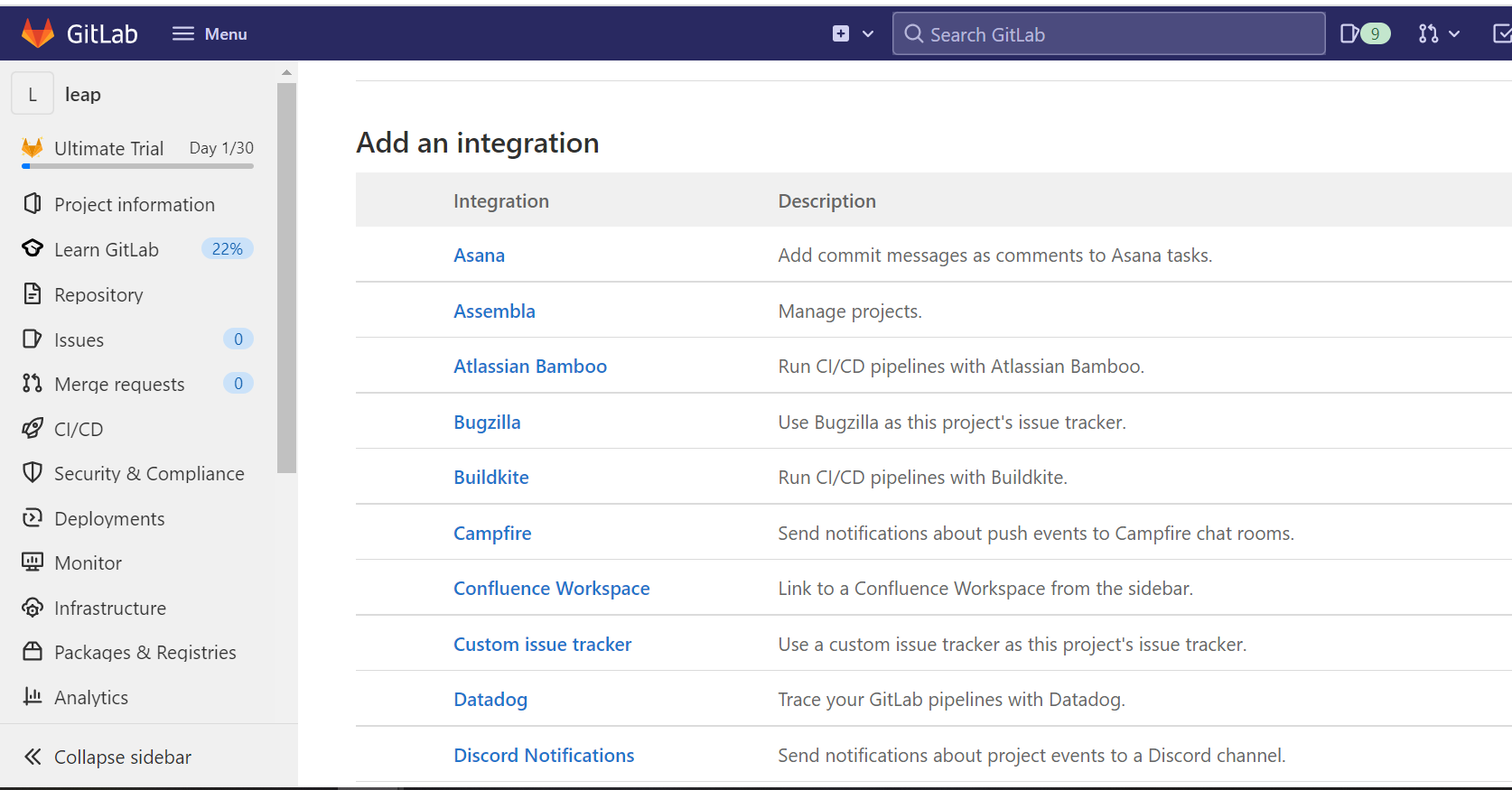 I'm not sure if it is your intention to keep the integrations list in the project settings as simple as possible but if not, here are a few things that might improve working with it: