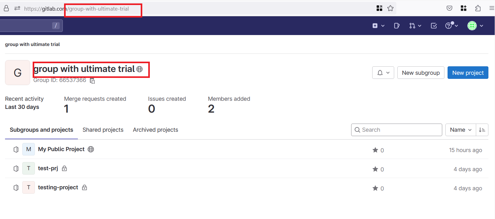 group with ultimate trial is a public group with SAML SSO set up and enforce SSO-only authentication enabled.
