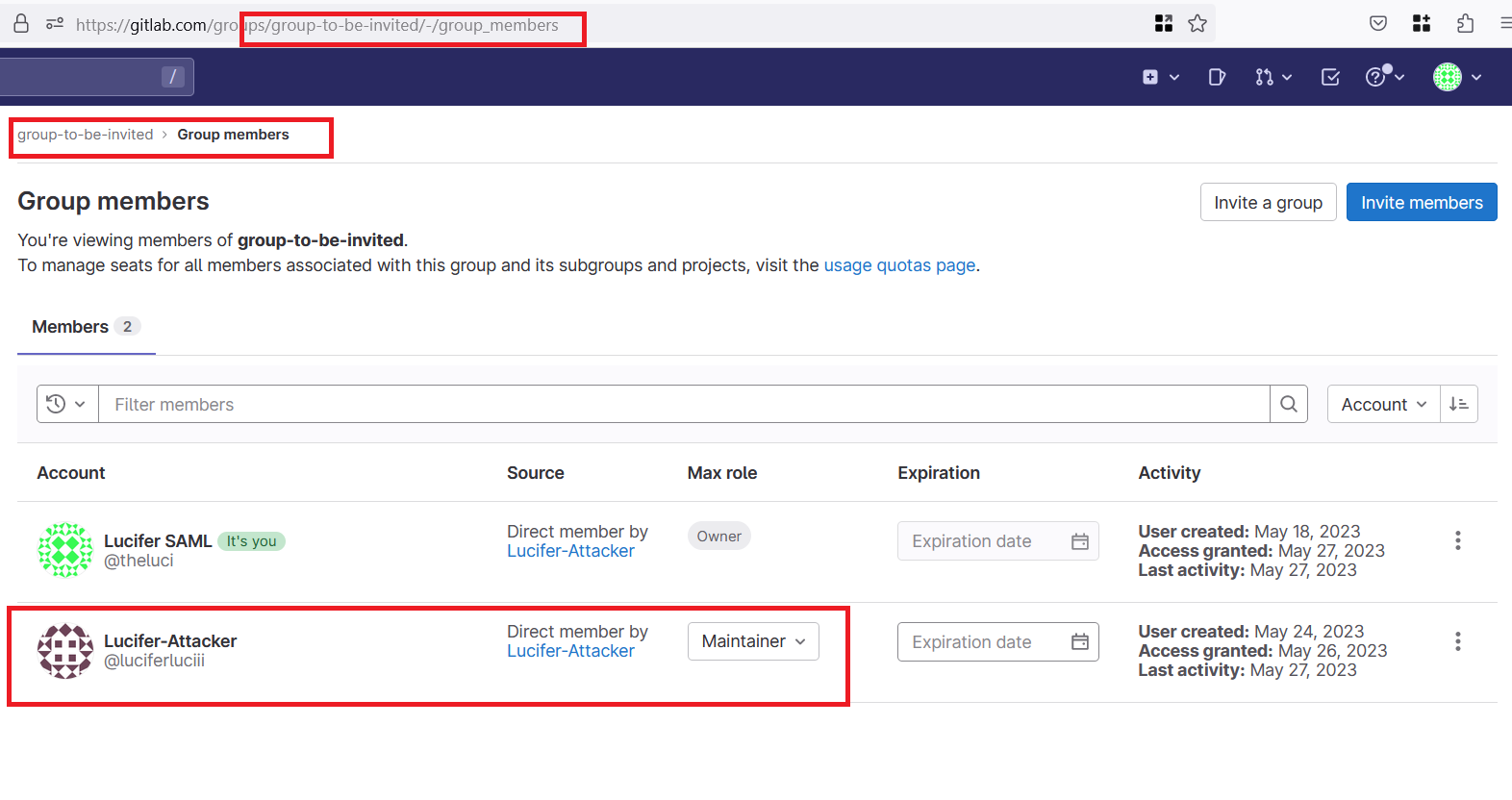 victiminvitesgroup-to-be-invitedwith maintainer role.