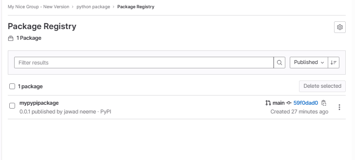 - Wait a couple of minutes, then navigate to https://gitlab.com/GROUP/PROJECT/-/packages, and verify that a new package is created -- Now you can directly jump to step 9, or if you wanted to add another layer of security you can continue in order. But at this point, no external users should be able to access this package