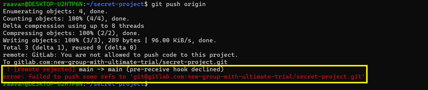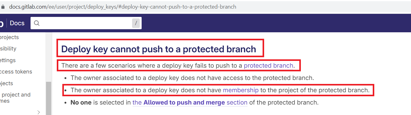 That is, for private projects, a non-project member cannot push to protected branches (even if he has access) using his deploy key. If he tries to do so, he is shown the following error,