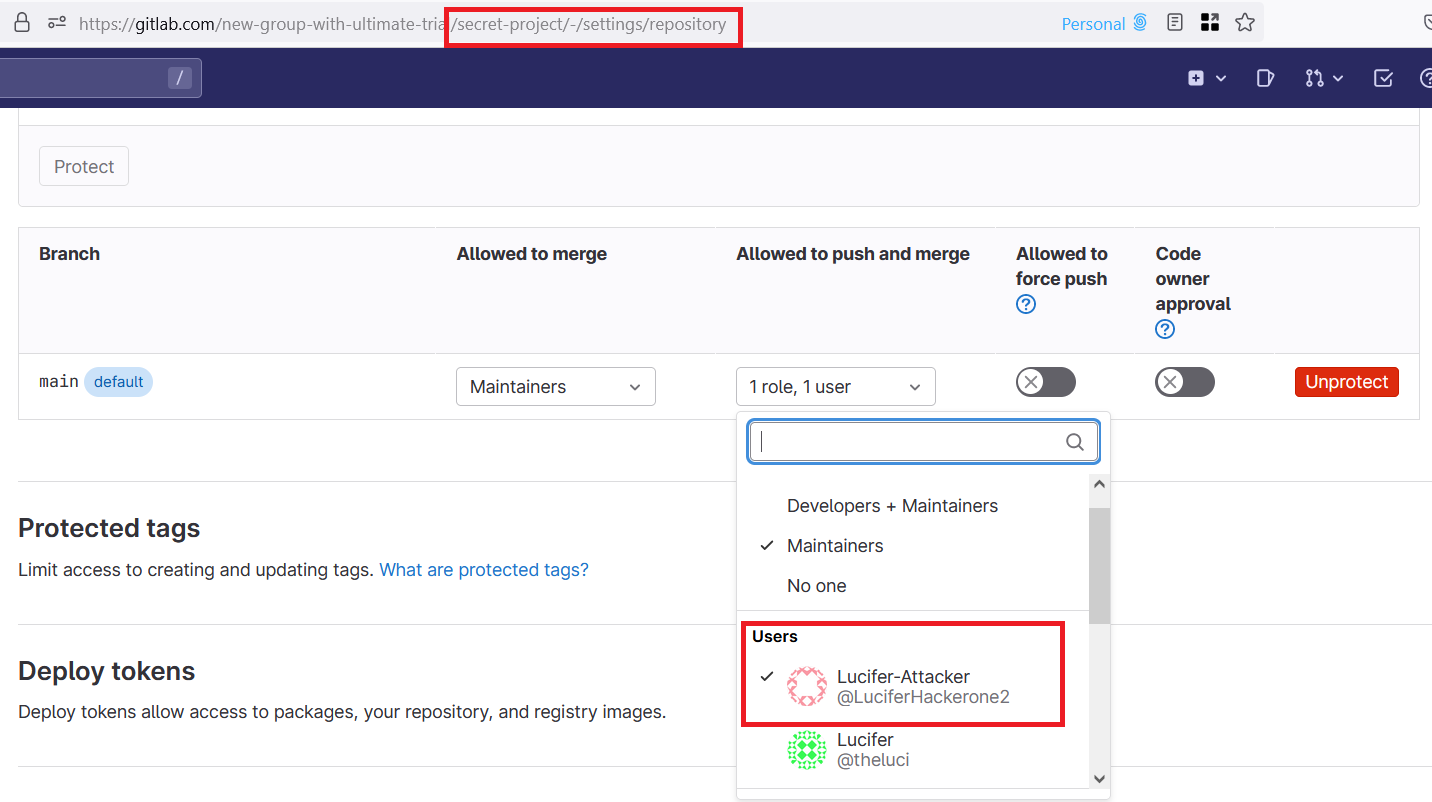 5. attacker goes to https://gitlab.com/<victim-group>/<victim-project>/-/settings/repository, Expand Protected branches and gives himself Allowed to push and merge access on protected branches.