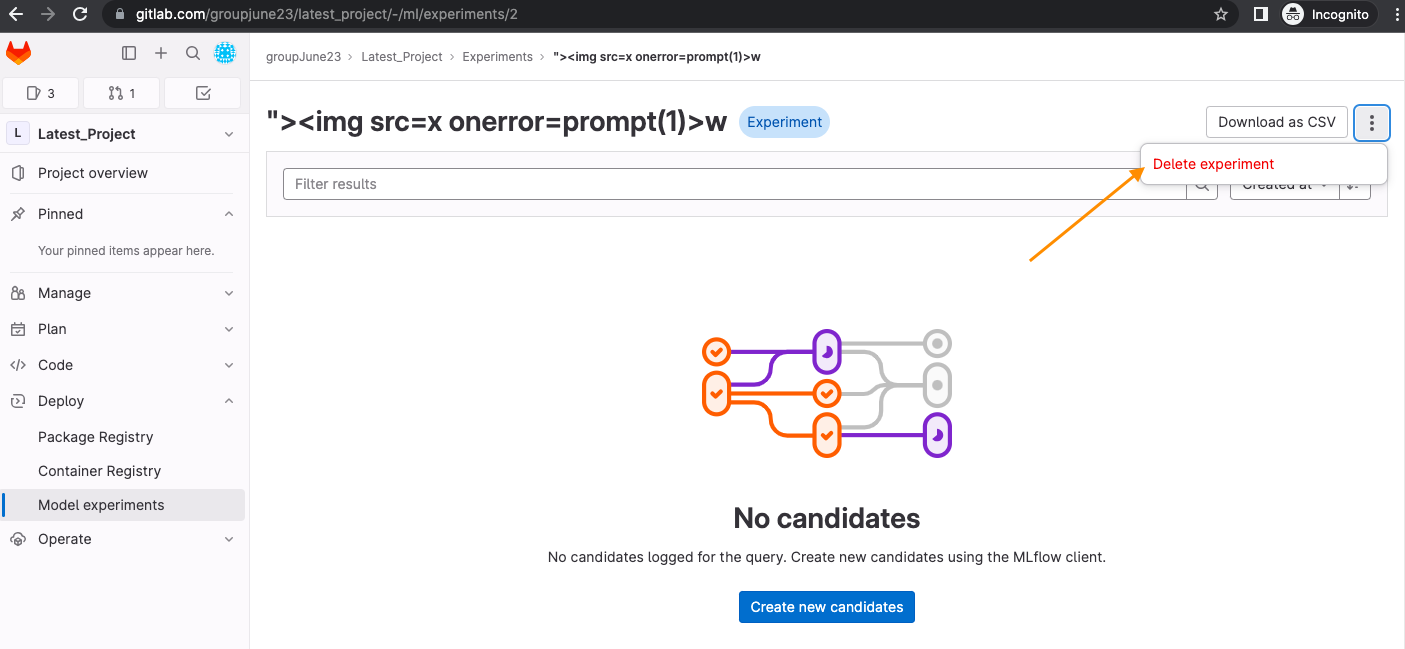 4.Similarly, in private projects, login as guest user and navigate to https://gitlab.com/<groupNamespace>/<projectNamespace>/-/ml/experiments and you will be able to see them as well as guest user in private project where as document clearly says it needs Developer role. You can delete it too!