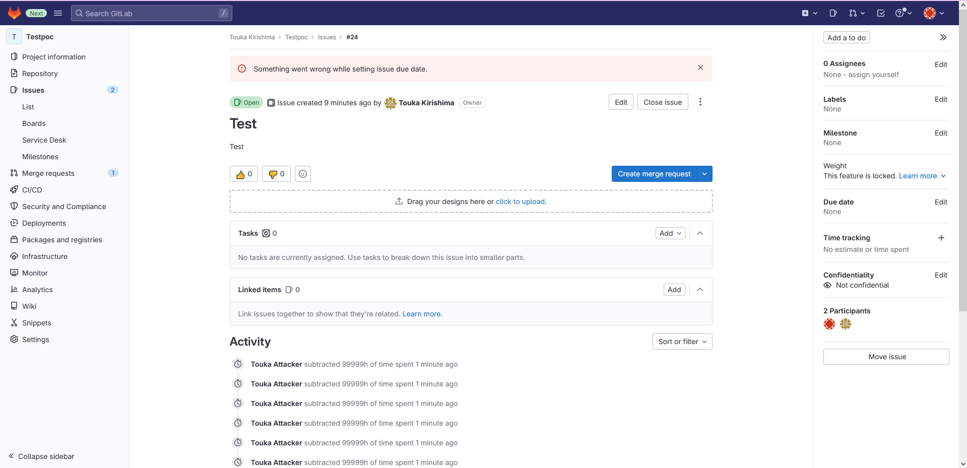 I found a DOS vulnerability when add Time spent on Issue, as an attacker I can make the victim unable to see the Time tracking report and also see the Issue on the Board.