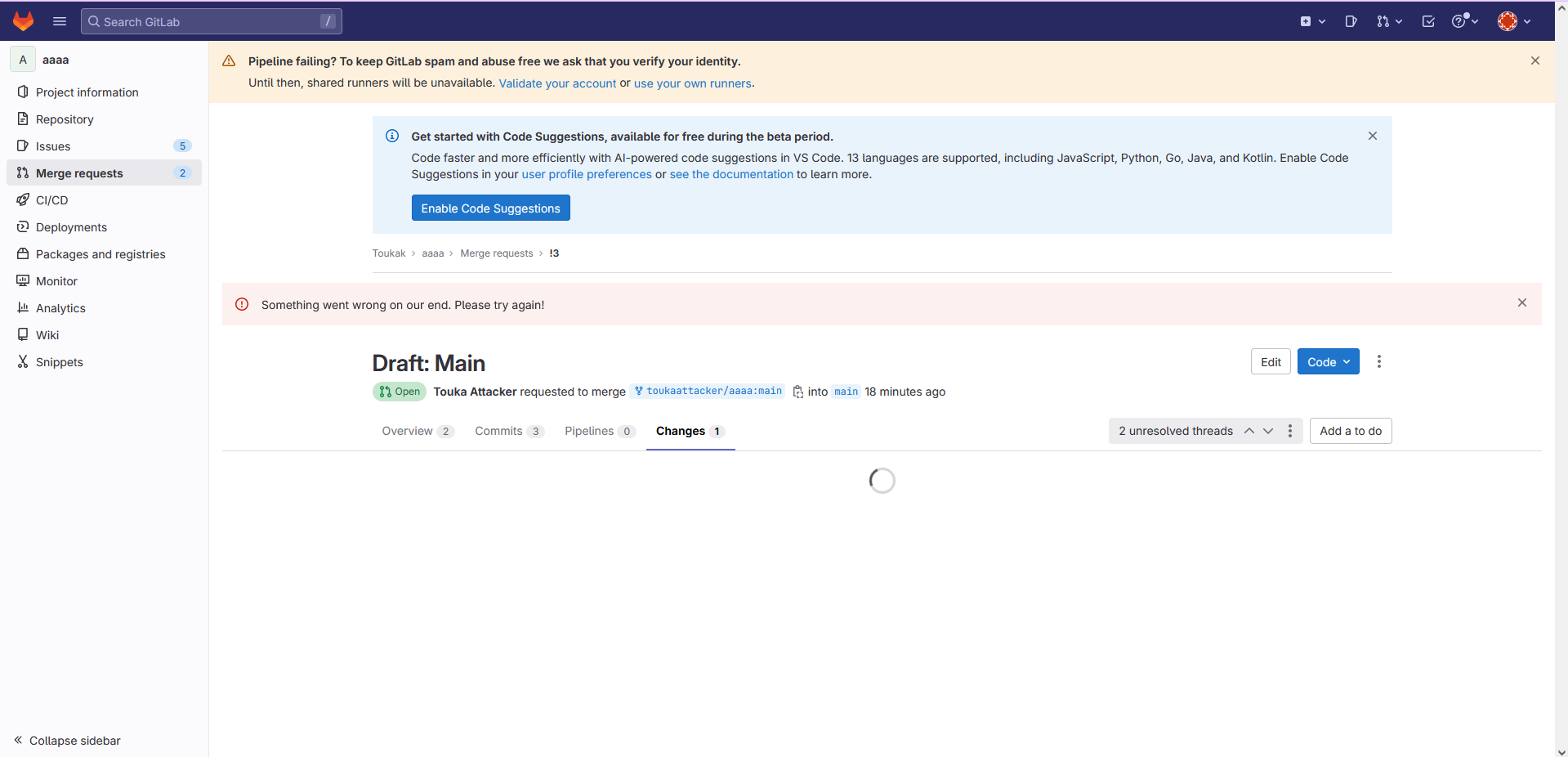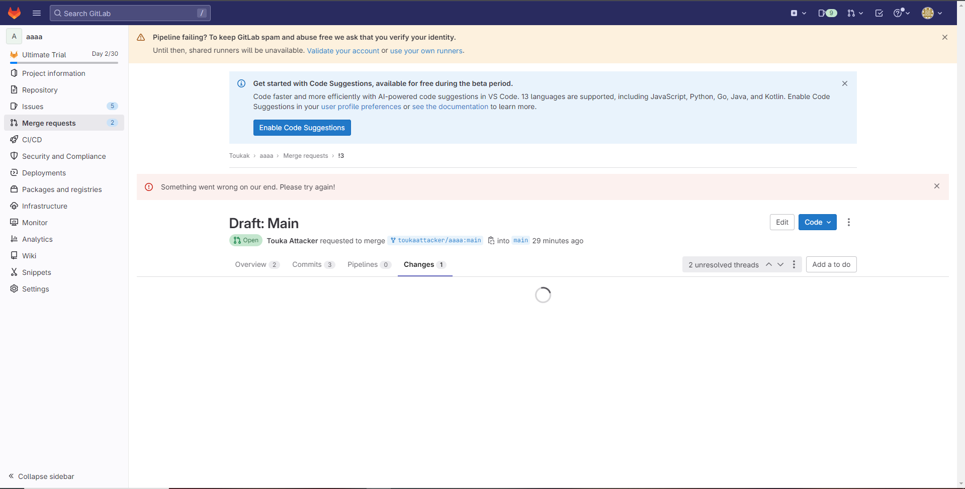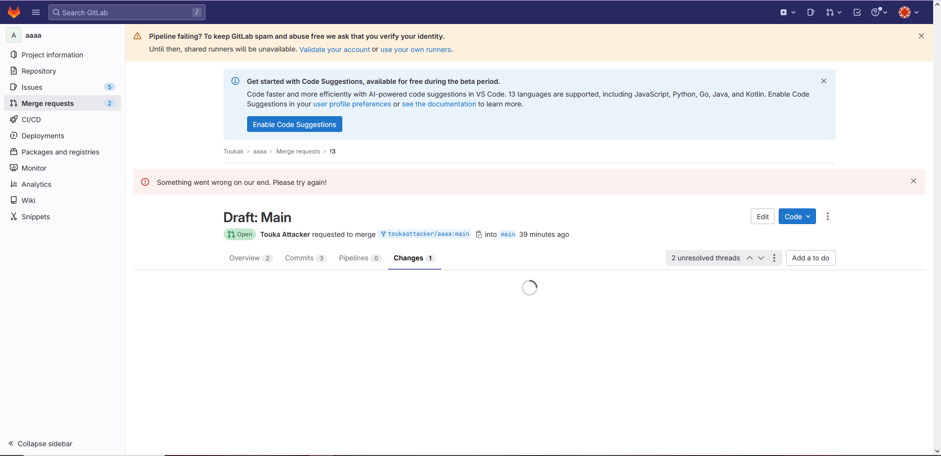 - Reload the page and you unable to load file on Changes menu and cant delete the thread