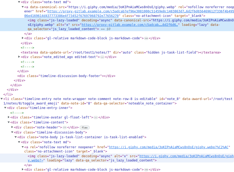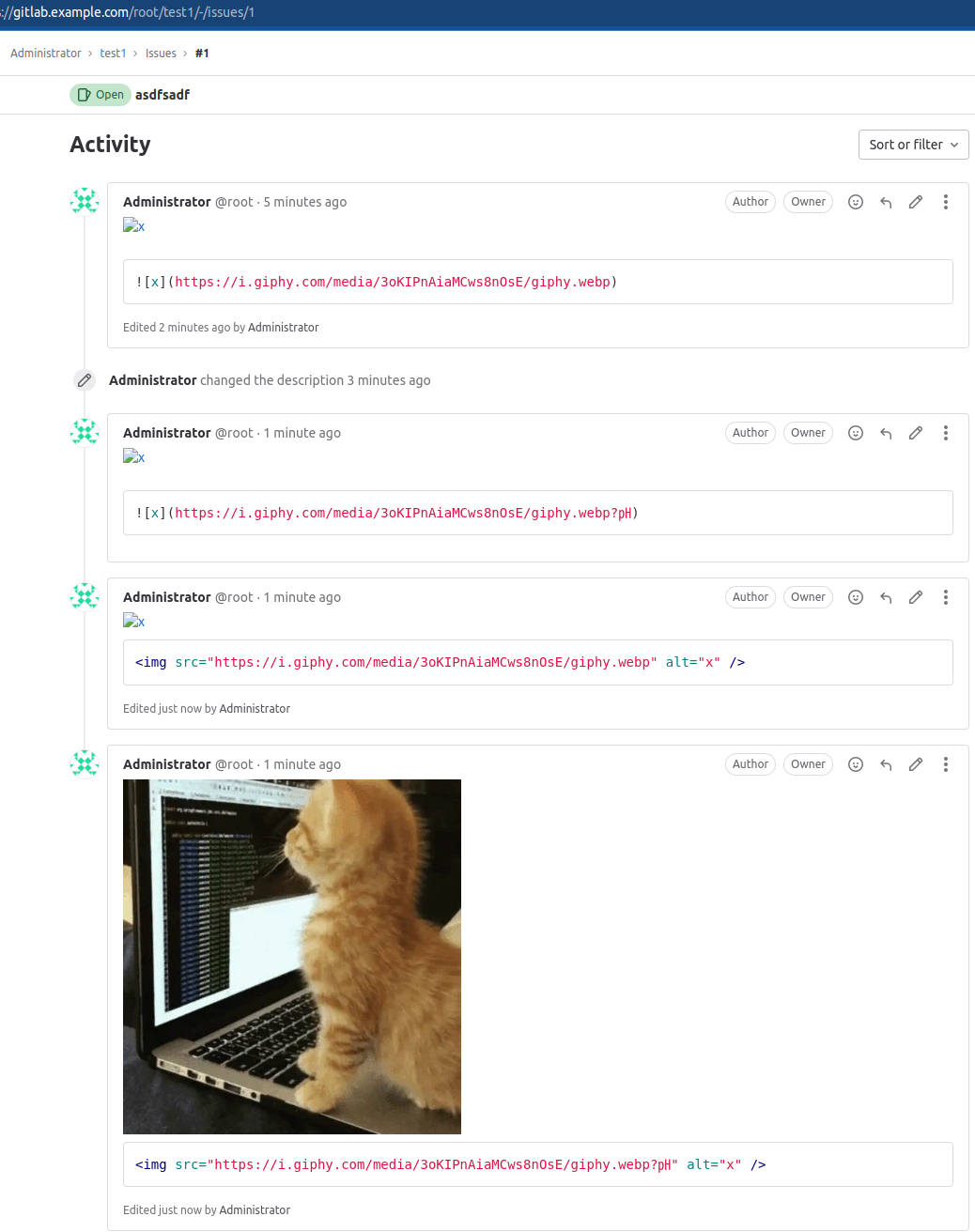 - Write markdown somewhere in Gitlab e.g. an issue comment. The following 3 markdown images load (or fail to load) via the asset proxy. Verify that they do not load directly from giphy.