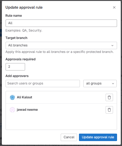 - Add MR approval rule to require 2 approvals before merging any MR, Project Settings => Merge requests => Merge request approvals
