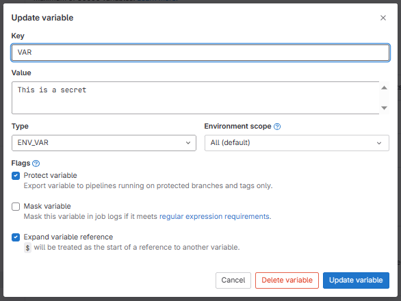 - Add a protected var in that group, Group Settings => CI/CD => Variables
