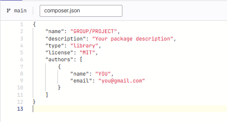 composer.jsonand add your GROUP/PROJECT in the name field, and change the author name/email