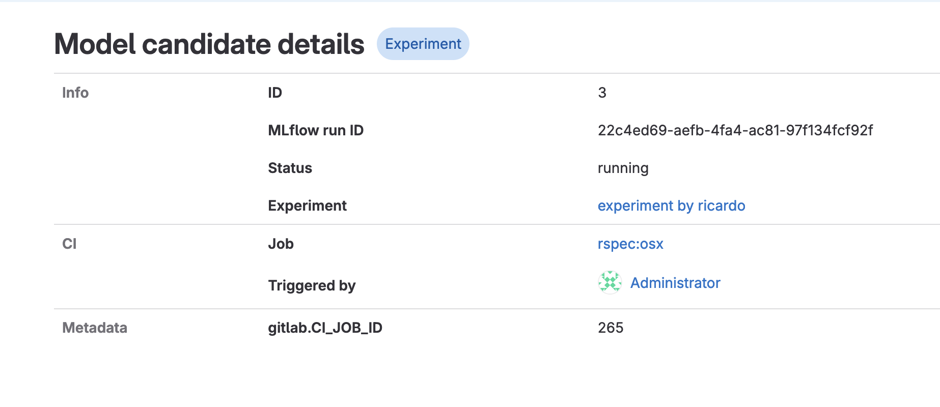 http://127.0.0.1:3000/ricardobrito1/ricardobrito1-project/-/ml/candidates/3(please change the path according to your project or simply go to the menu on the left side->analyze->Model Experiments and click on the candidate), I can see the private job details under the CI section (user who triggered the job and name of the job), which means I have successfully associated a private job of a private project to my Machine Learning experiments: