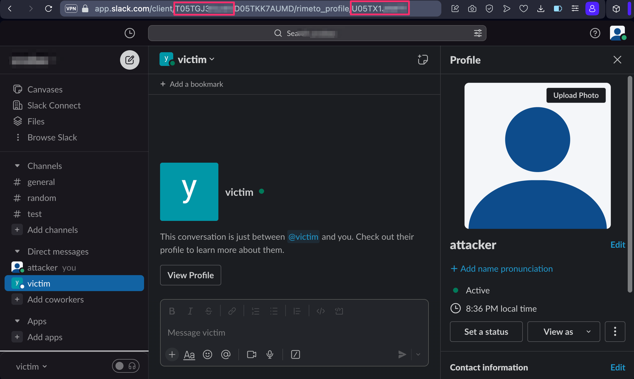 - Join to the invited Slack workspace using Web browser, then view victim's profile