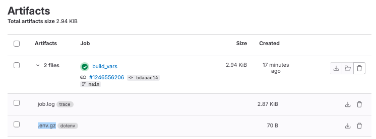 .gitlab-ci.ymlfile in that project, this job creates an ENV artifact, that's private and isn't accessible by unauthorized