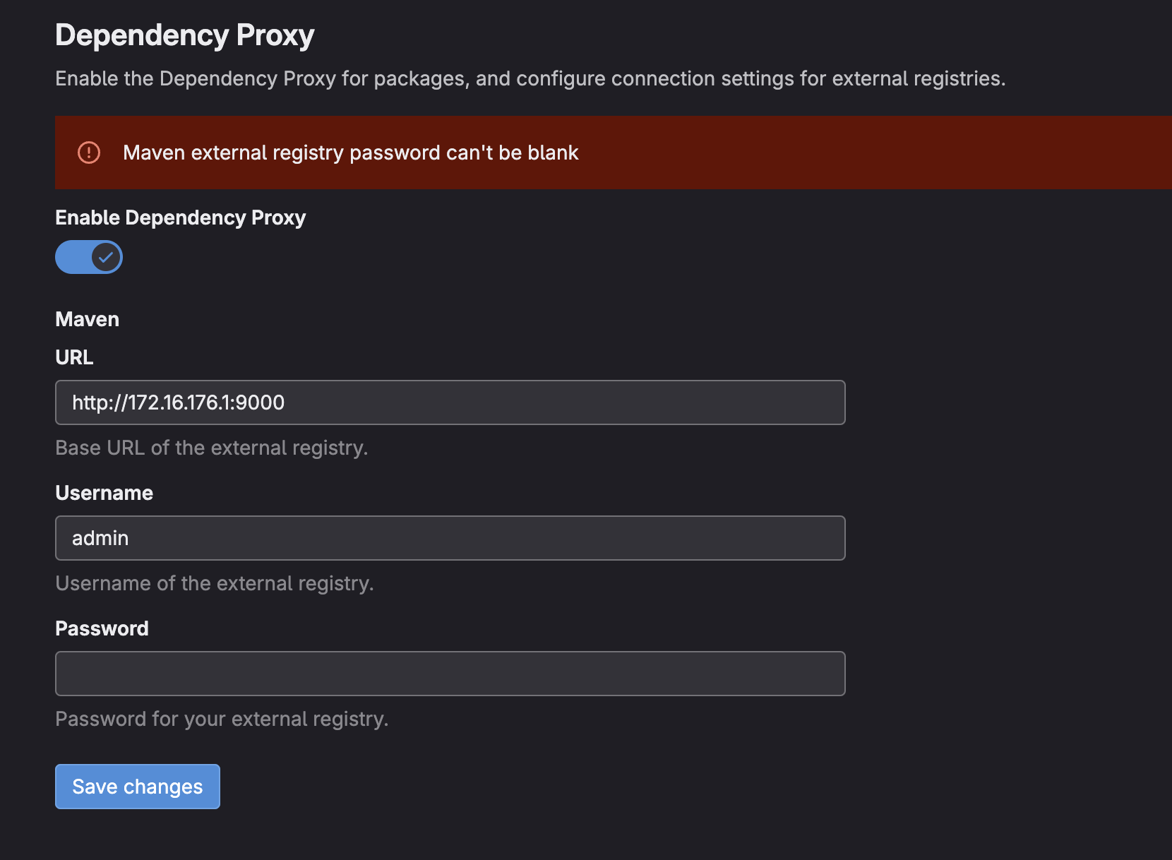 attacher, navigate to the Dependency Proxy settings page likeroot, modify the URL to our pre-configured address (do not enter a password). Upon clicking save, an error is displayed on the page.