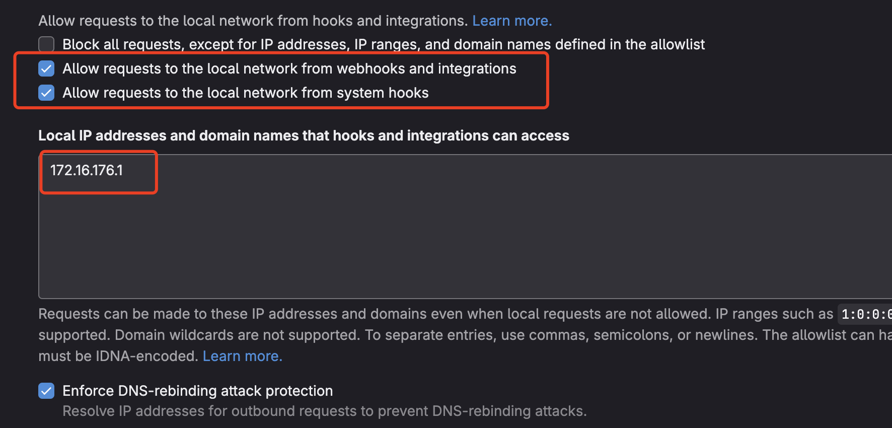 - As I do not have access to a cloud server, I set up this HTTP server locally. To allow GitLab to access this server, I have previously allowed 'Allow requests to the local network' in [Admin Area] -> [Settings] -> [Outbound requests].