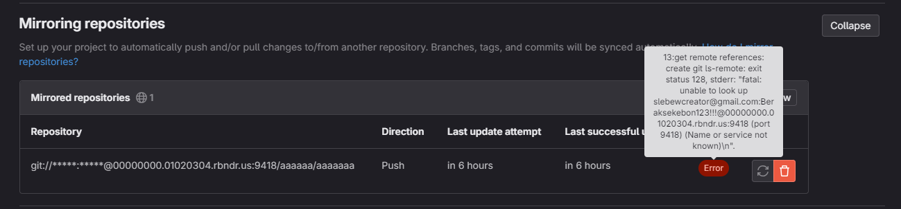 When a user forces a push, Update now ( ) GitLab leaks the user's password when adding a mirror with GIT credentials. When you press in the Mirroring repositories section it displays username and password errors.