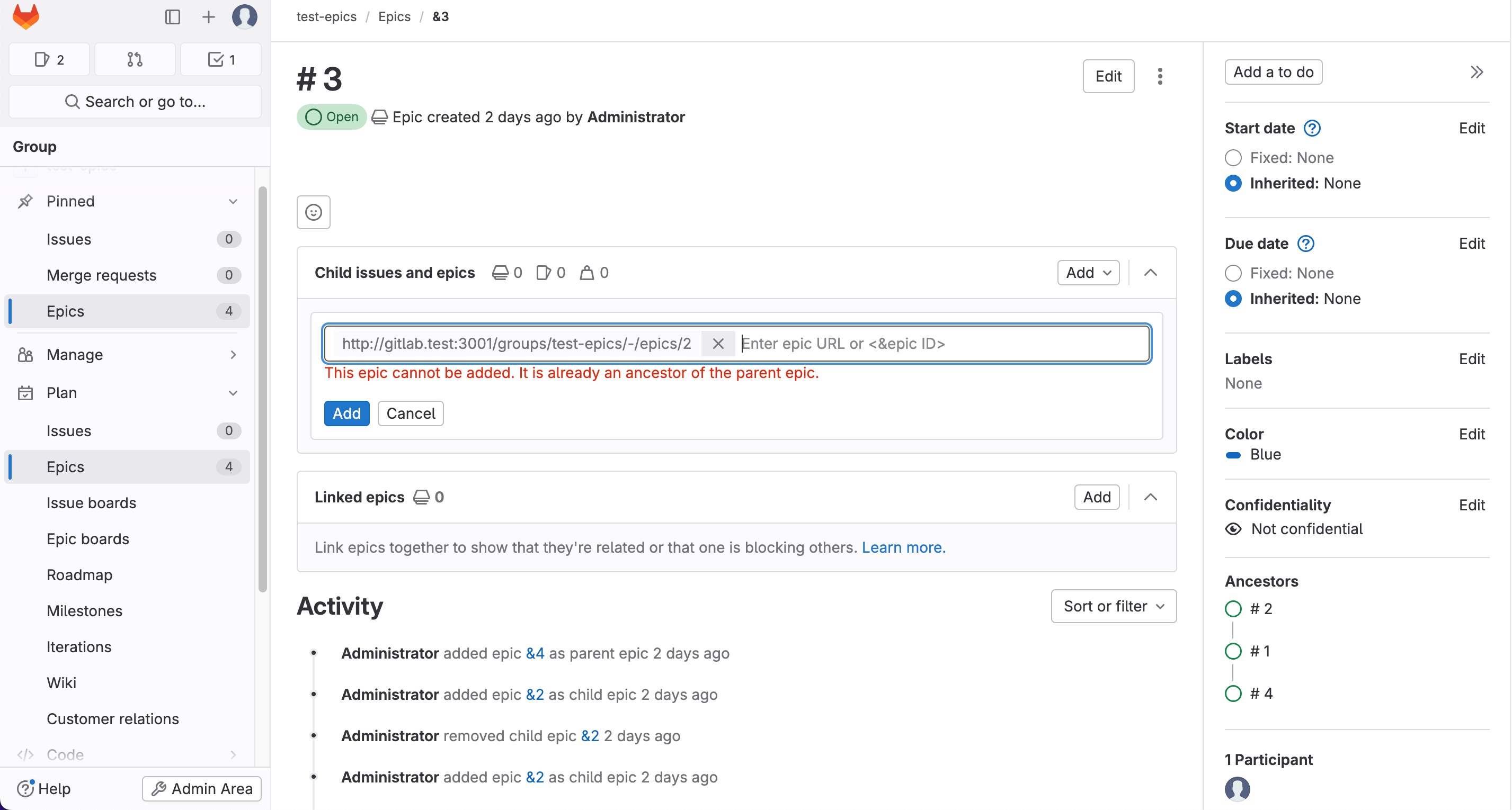 idandiidof these 4 epics by visiting api url in your browserYOUR_HOST/api/v4/groups/GROUP_NUMBERIC_ID/epics/EPIC_NUMBER. such ashttp://gitlab.test/api/v4/groups/94/epics/6 - view the source code of one HTML page of your Gitlab instance and get the