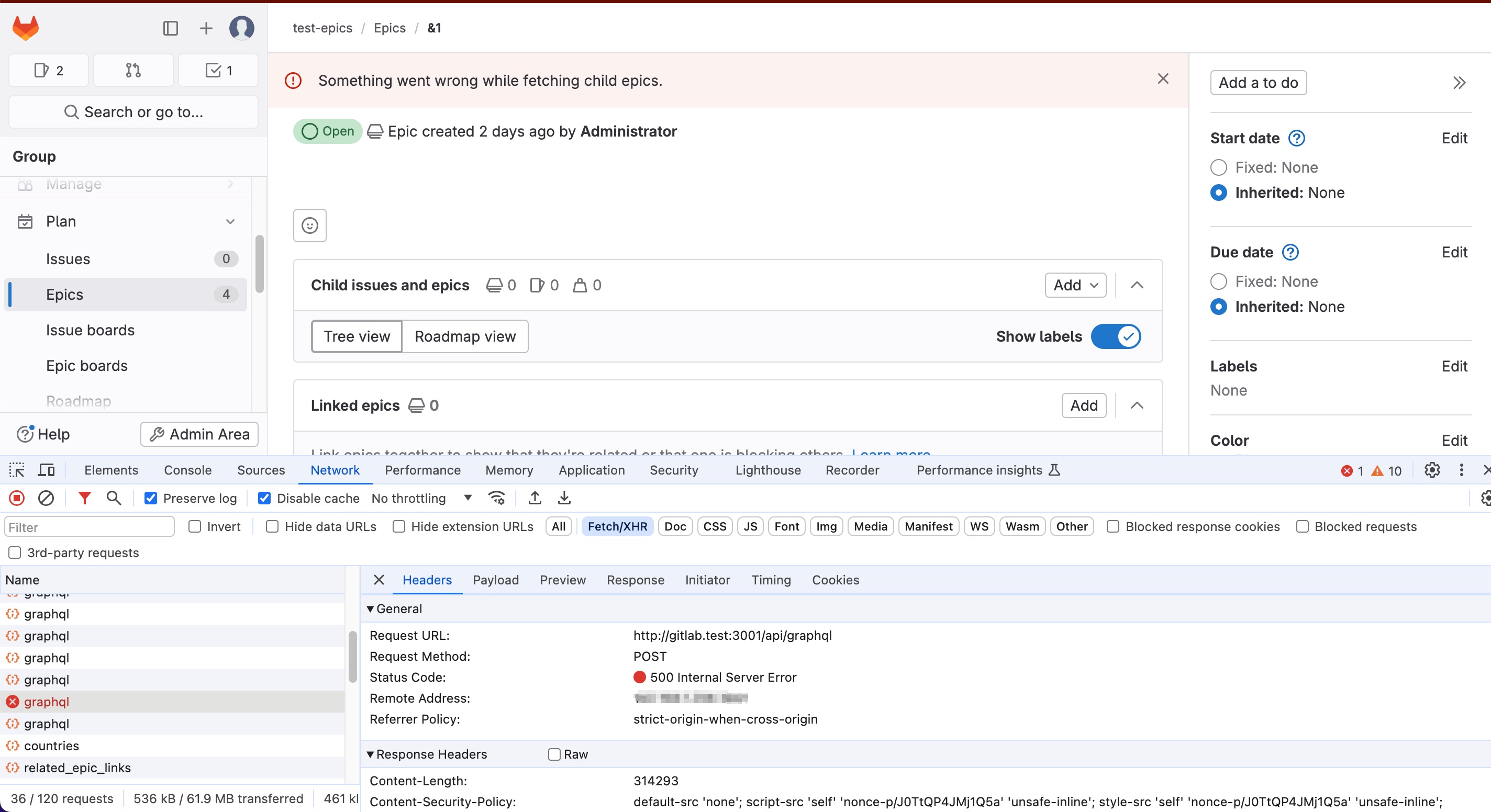 - Visit one of your epic pages, and you should see an error message and a 500 on the associated graphql call