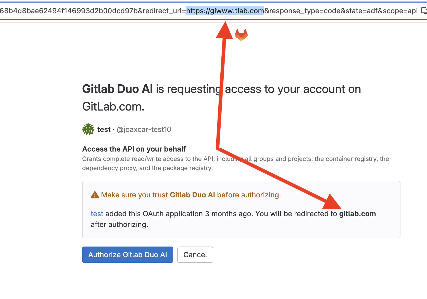 When visiting the permission prompt gitlab will show an orange box that will inform the user what URL that is trusted