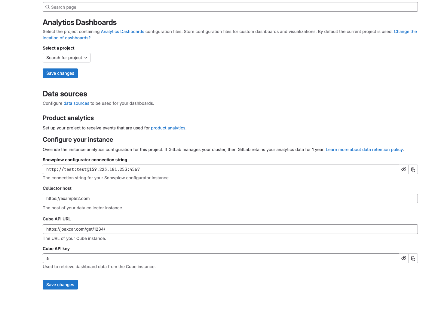 (note step 4 IP 159.223.181.253:4567 this is my own collector server on Digitalocean. Its possible to set up your own, but its only needed to get a valid configuration and does not do anything else, if you want to run your own deploy https://gitlab.com/gitlab-org/analytics-section/product-analytics/devkit on a droplet)