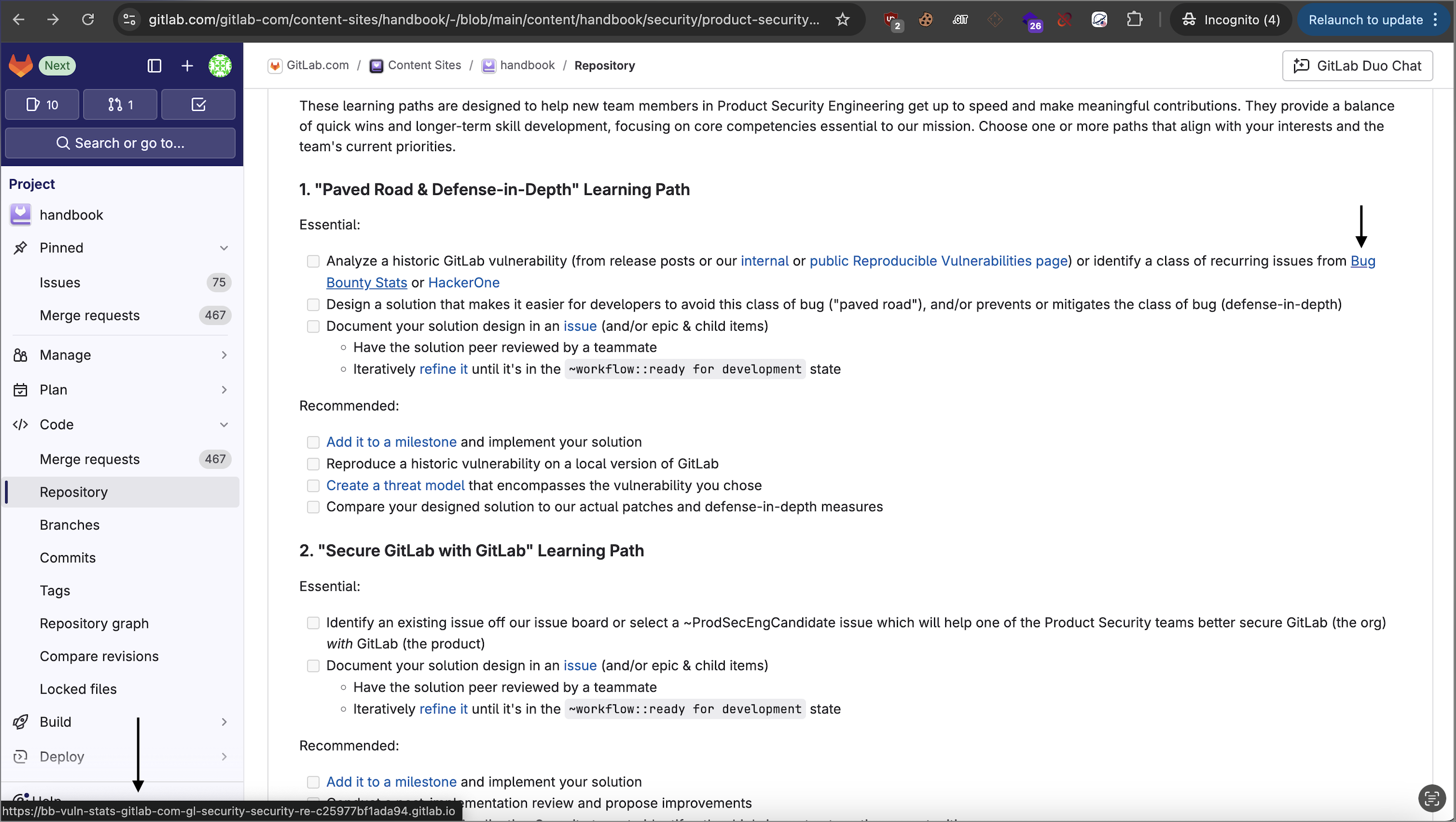 https://gitlab.com/gitlab-com/content-sites/handbook/-/blob/main/content/handbook/security/product-security/product-security-engineering/runbooks/team-member-upskilling.md#:~:text=identify%20a%20class%20of%20recurring%20issues%20from%20Bug%20Bounty%20Stats