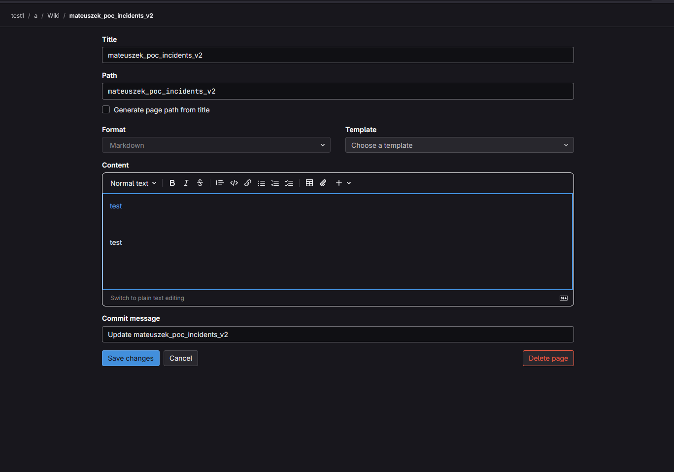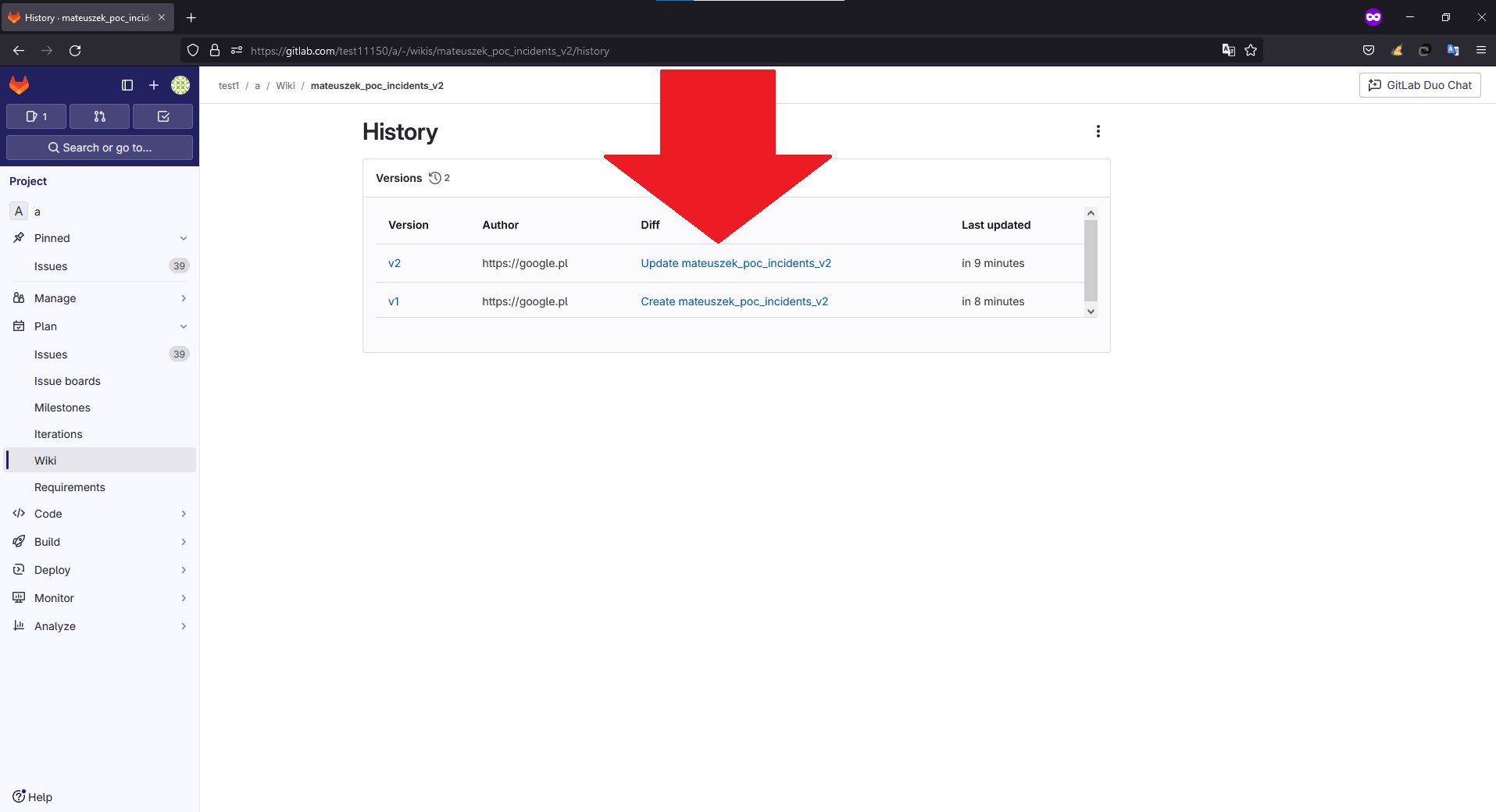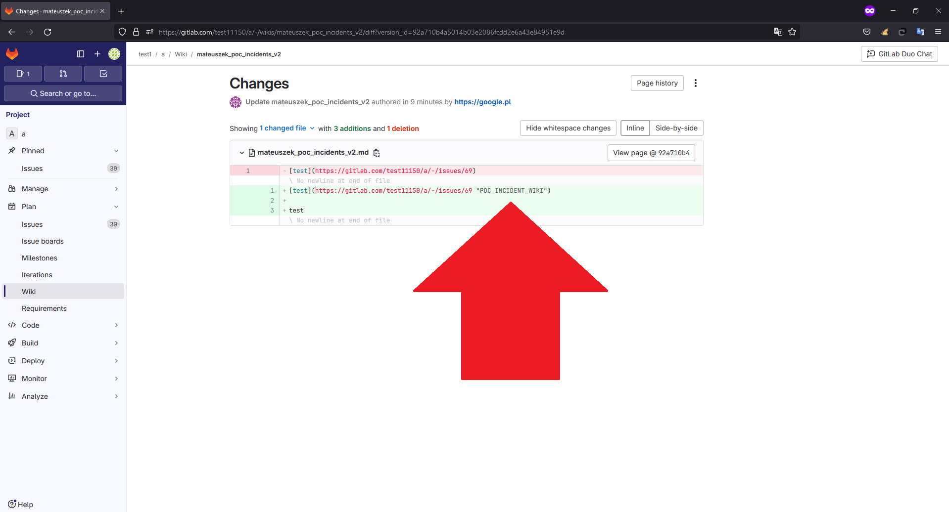 - User B - notice that in the Diff view there is visible for you the title of the PoC confidential incident - Privileges escalation to read confidential incidents by unauthorized actor in Gitlab Wiki by Wiki History Diff feature