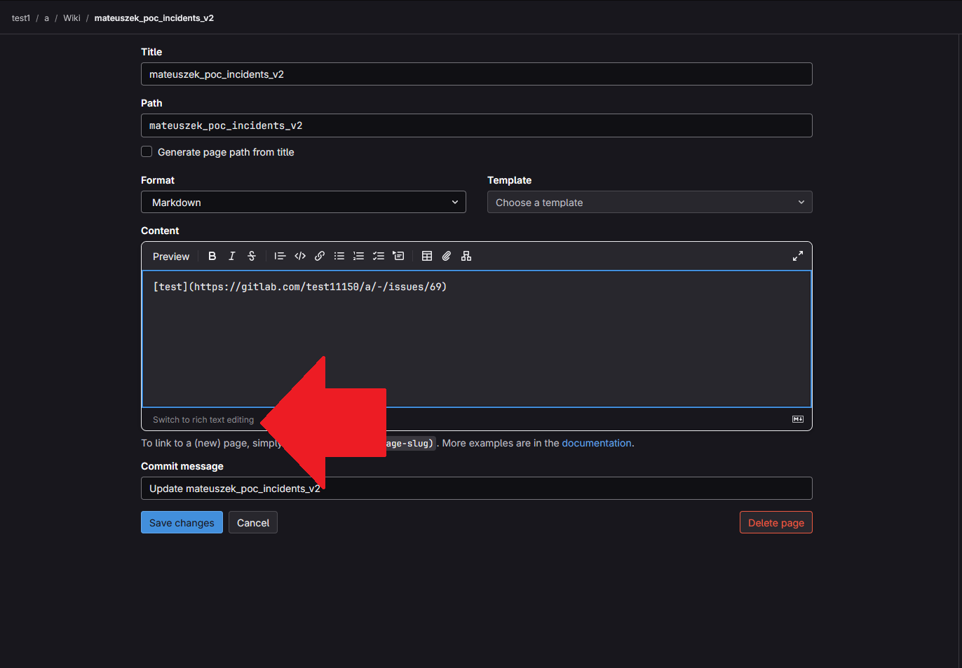 3. User A - now, click Edit (edit that page), click Switch to rich text editing and add something e.g.: test below the url