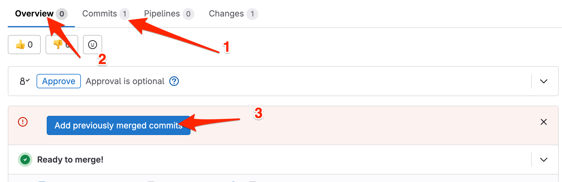 Commits, then clickOverview, then clickAdd previously merged commitsbutton
