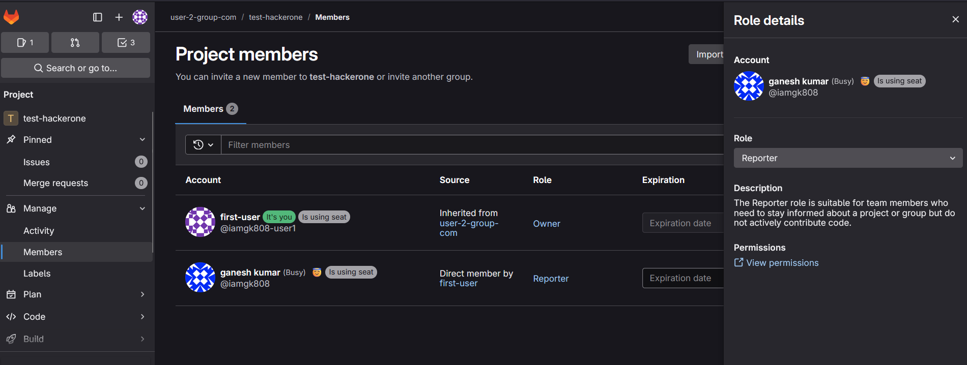 project-1>memberssection & invite theattackeruser with thereporterrole