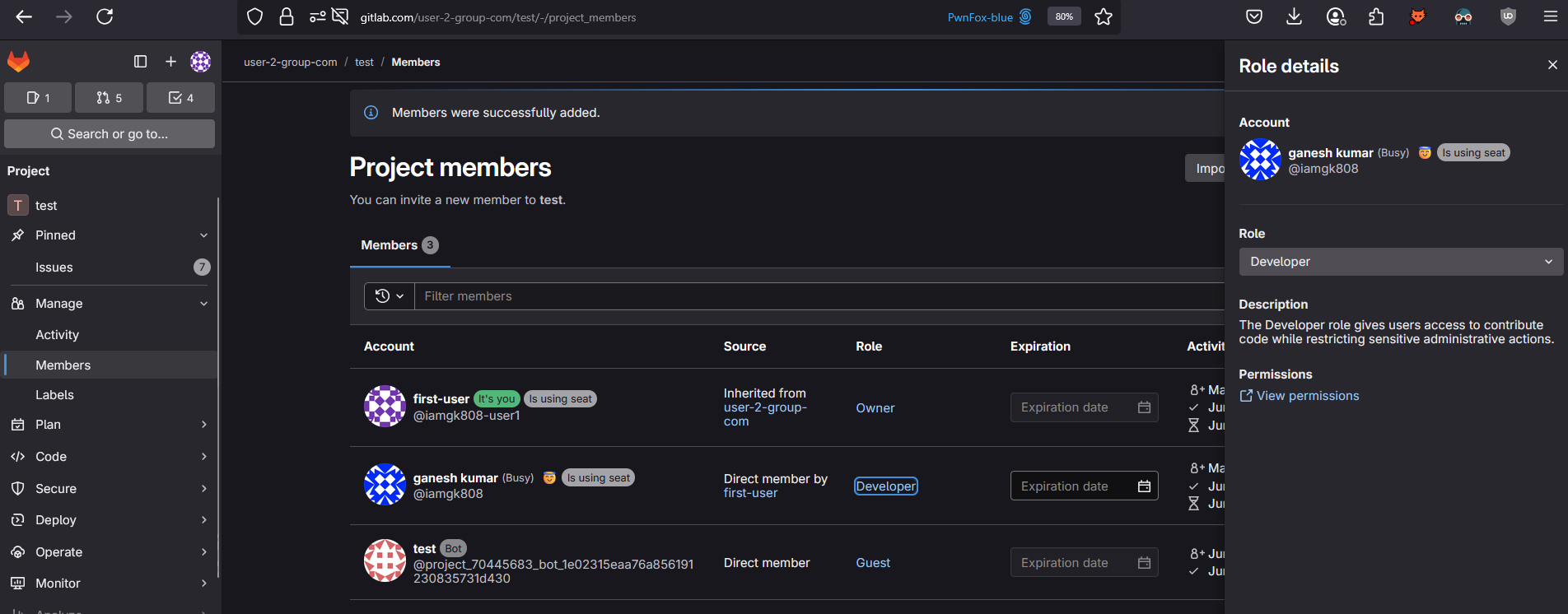 project-1>memberssection & invite theattackeruser with theDeveloperrole