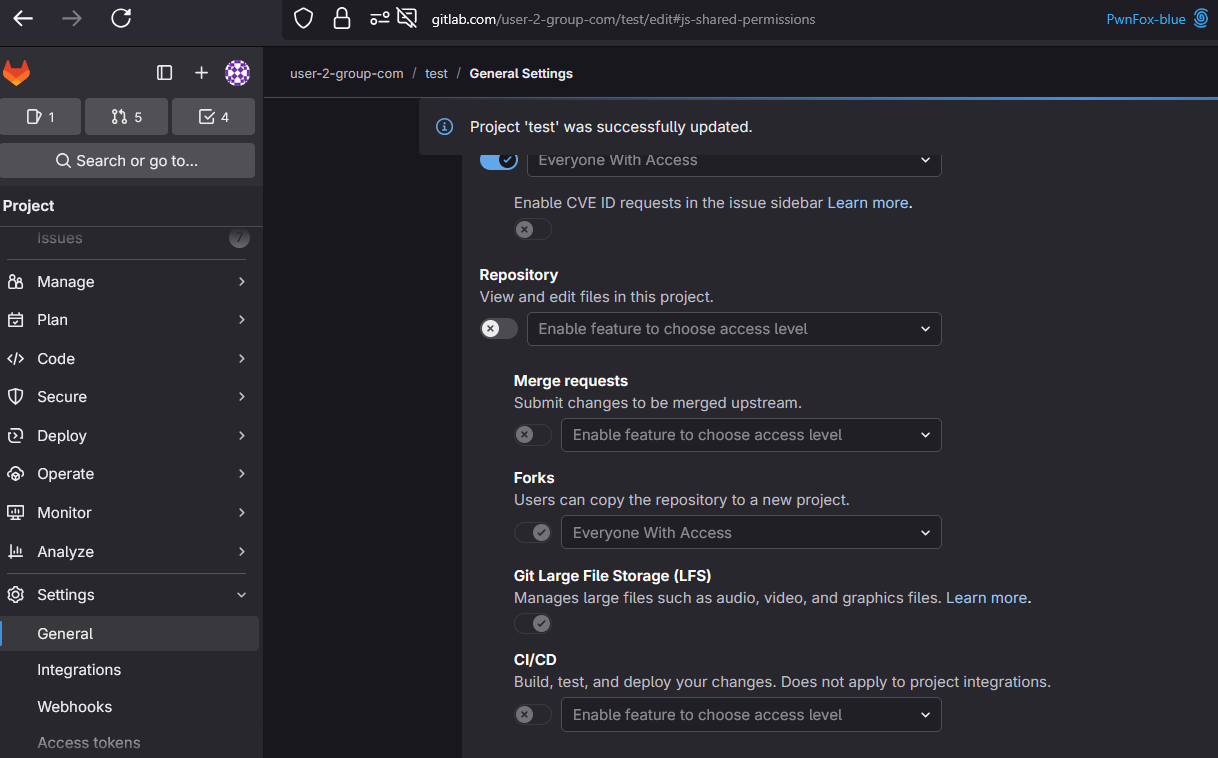 - Once the Repository option is disabled in a project, no one can view the project’s code, branches, merge requests, or CI/CD configuration details.