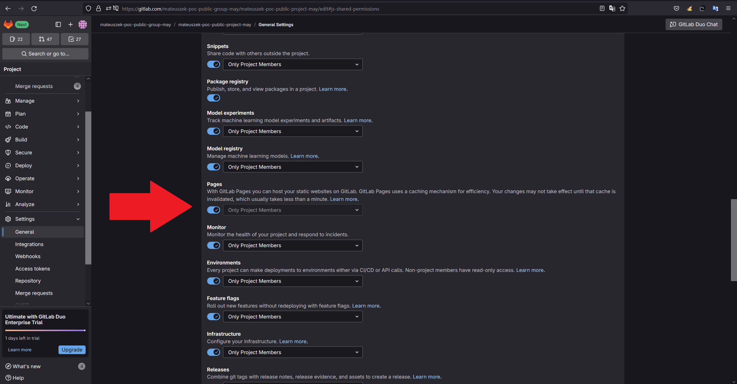 Settings->General->Visibility, project features, permissions->Pagesand notice that it should set asOnly Project Members - Enter to the PoC created Gitlab Pages from the second account that login to Gitlab cloud by Google Auth