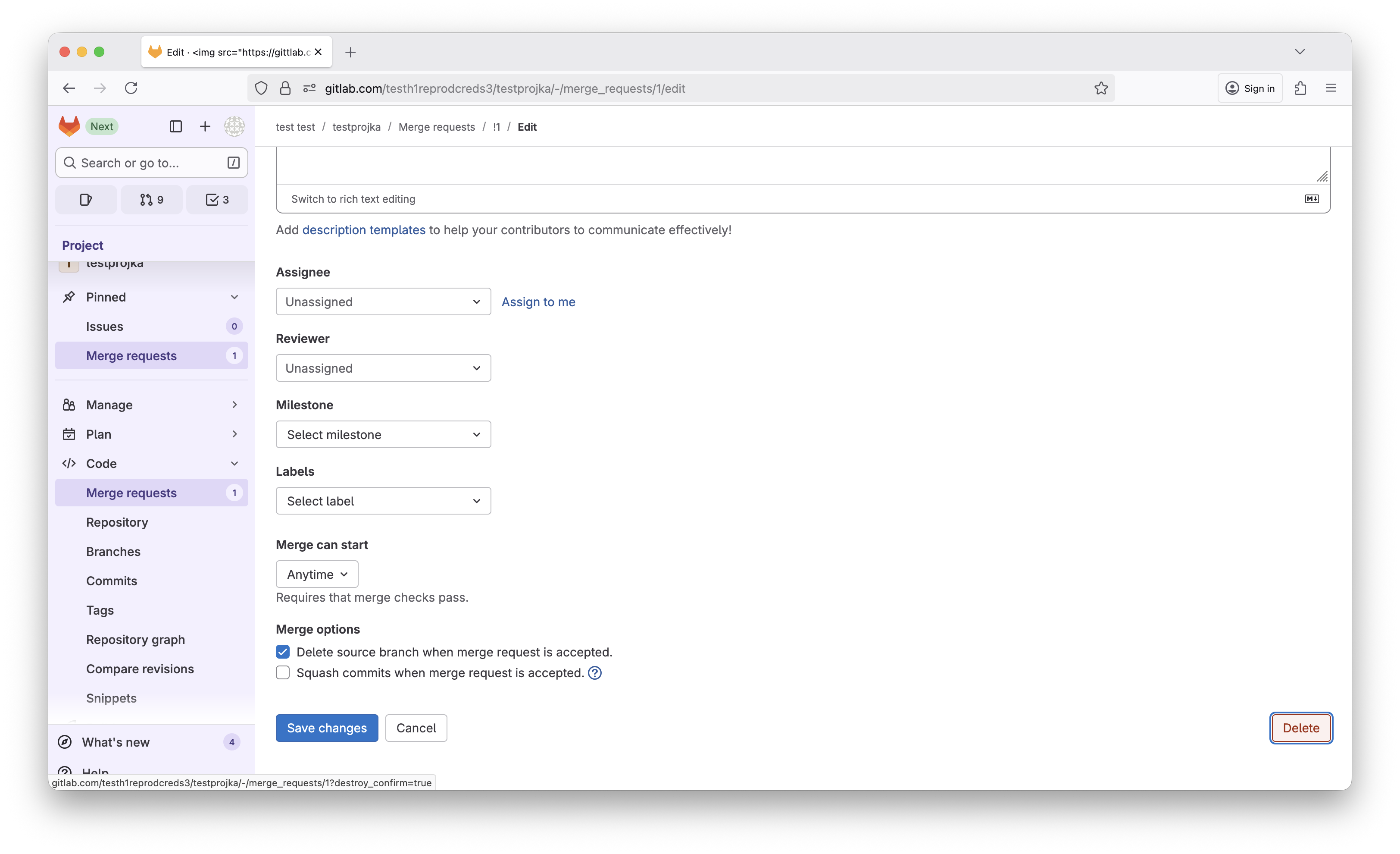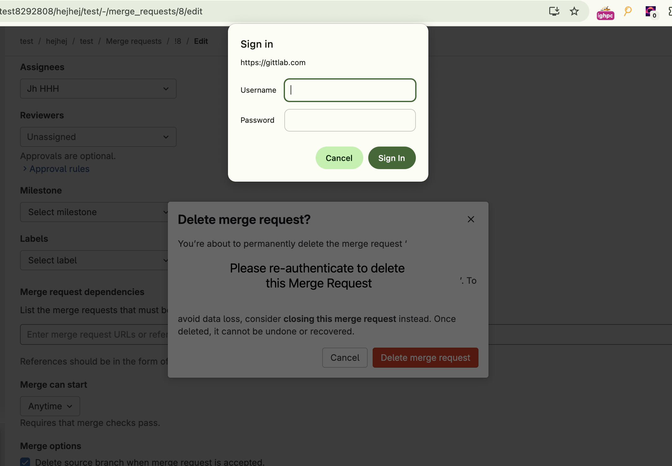 Editon the MR and then scroll to the botom to find theDeletebutton - When trying to delete the MR you will see the auth dialog and the image from my server