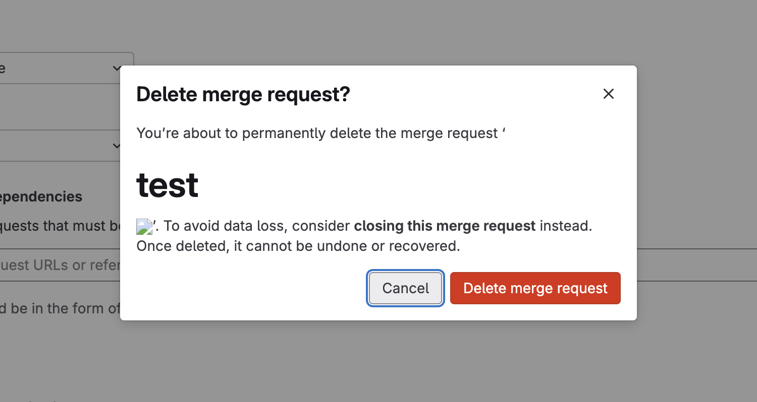 However, when a user tries to delete an MR that contains an HTML payload as its title, it will render through v-safe-html in the deletion dialog