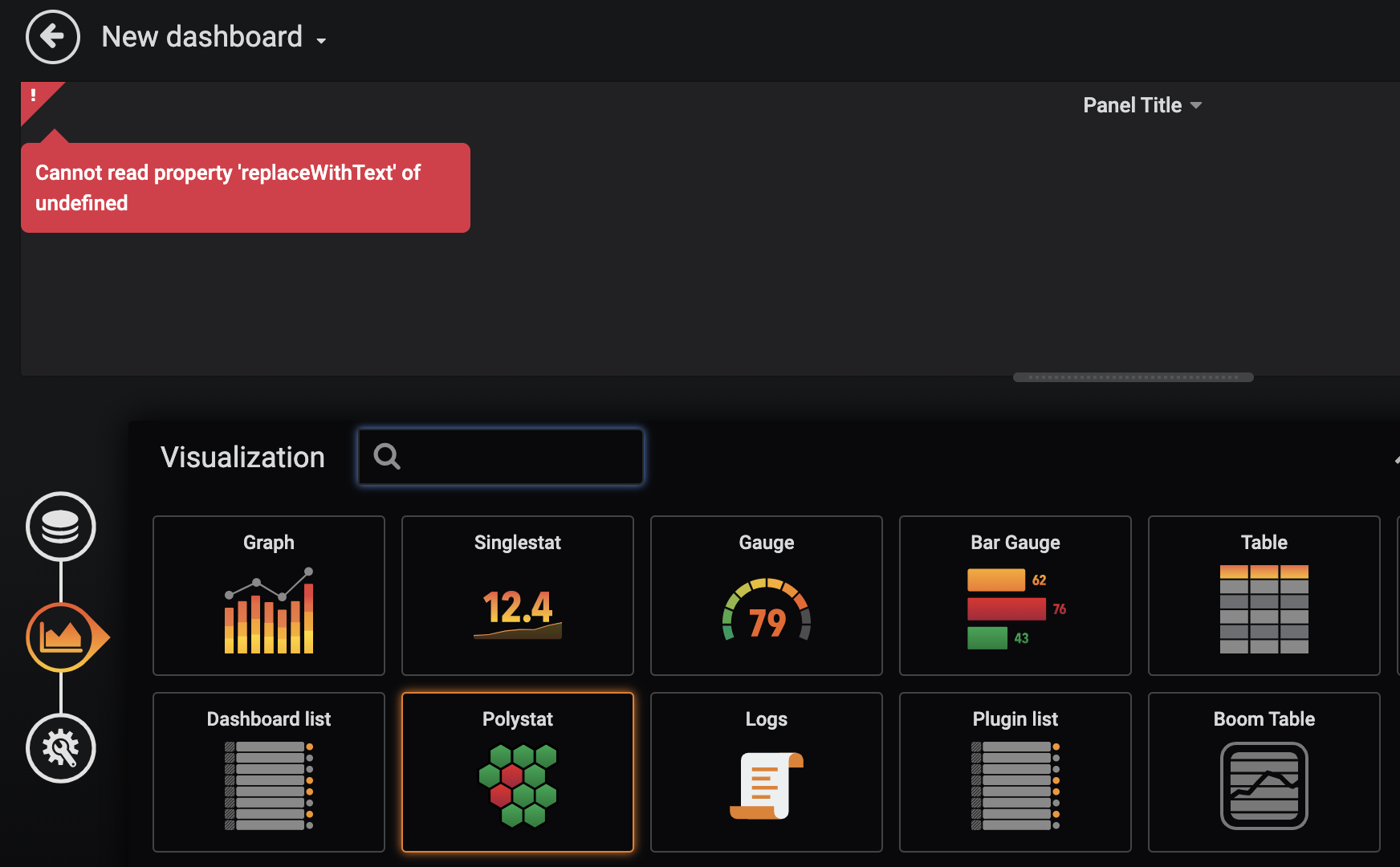 When i choose polystat for visualization, no matter what the query is(even without any query), the panel just throws error "Cannot read property 'replaceWithText' of undefined"