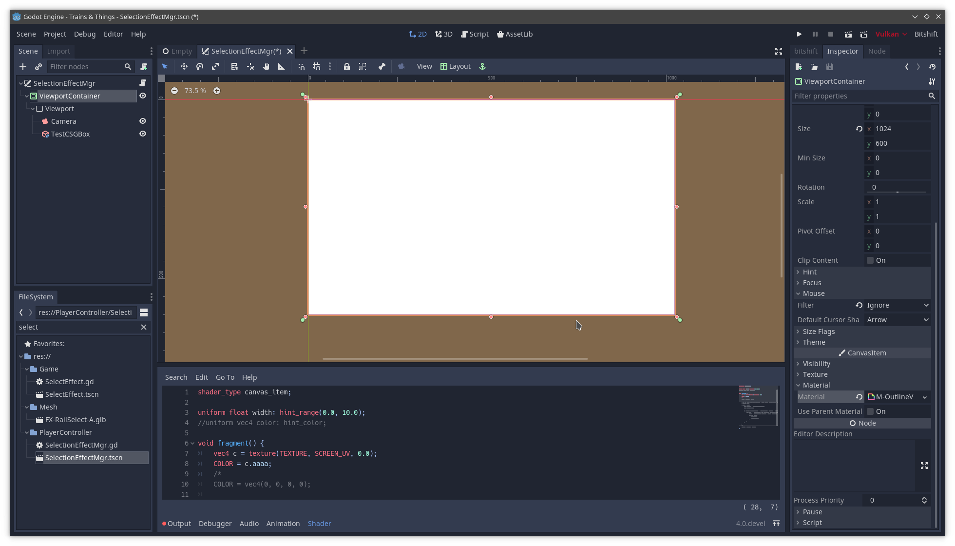 Issue description: I have a ViewportContainer with a Viewport child to render something in the viewport. I have a custom ShaderMaterial applied to the ViewportContainer with some code like this: