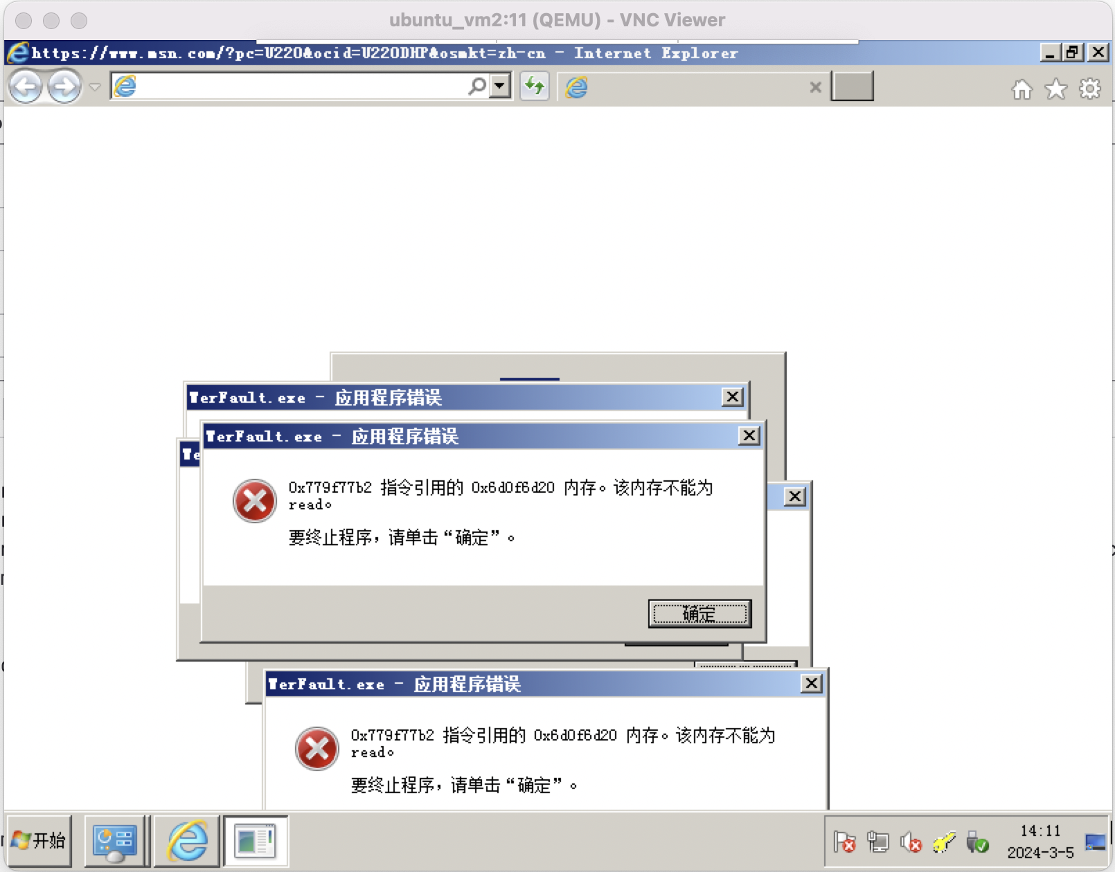 WerFault Application Errors always occur when I open IE or even control panel. It's OK on QEMU 7.2 & 8.0 version according to my debug experience about qemu-system-i386 flavor in the last few months.
