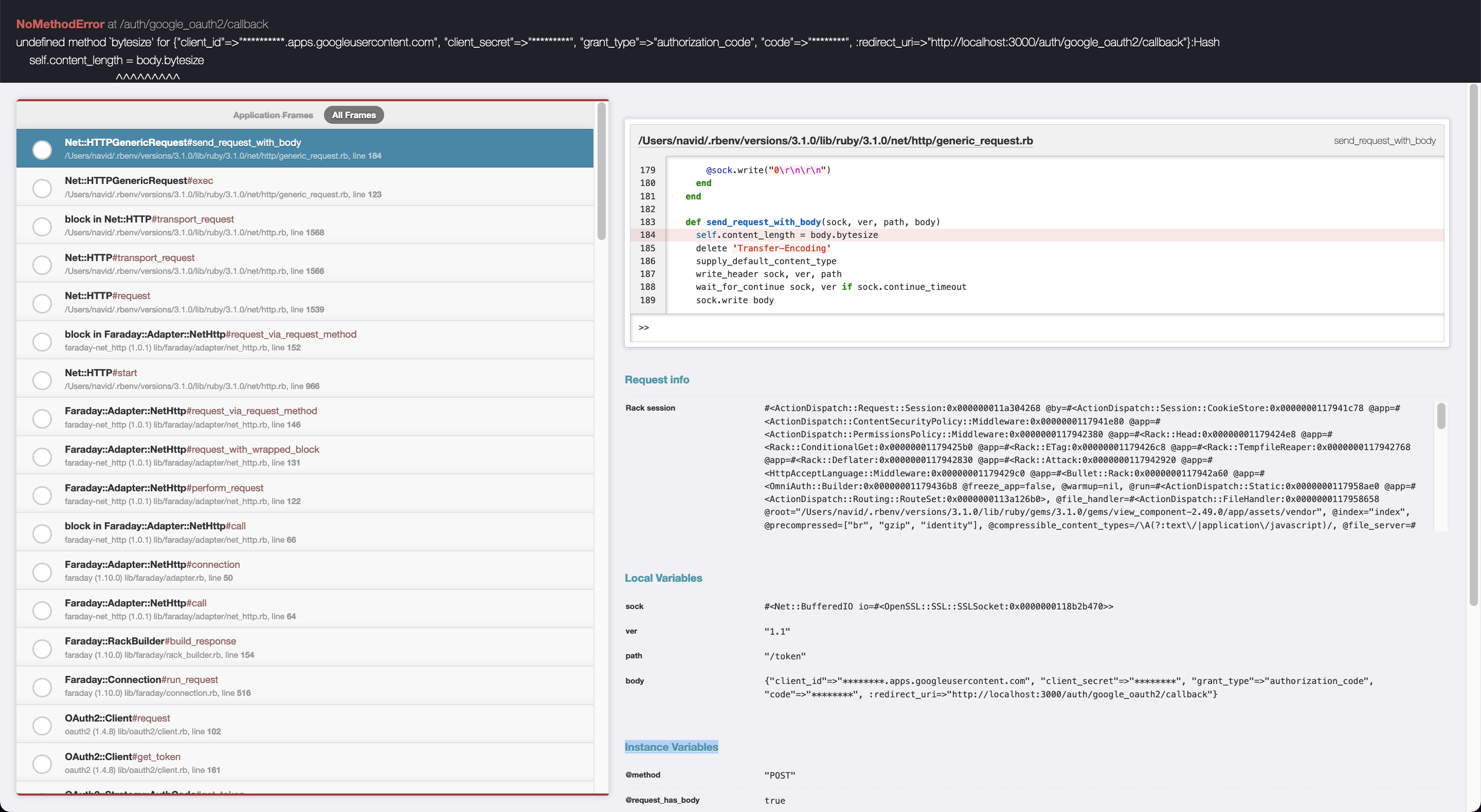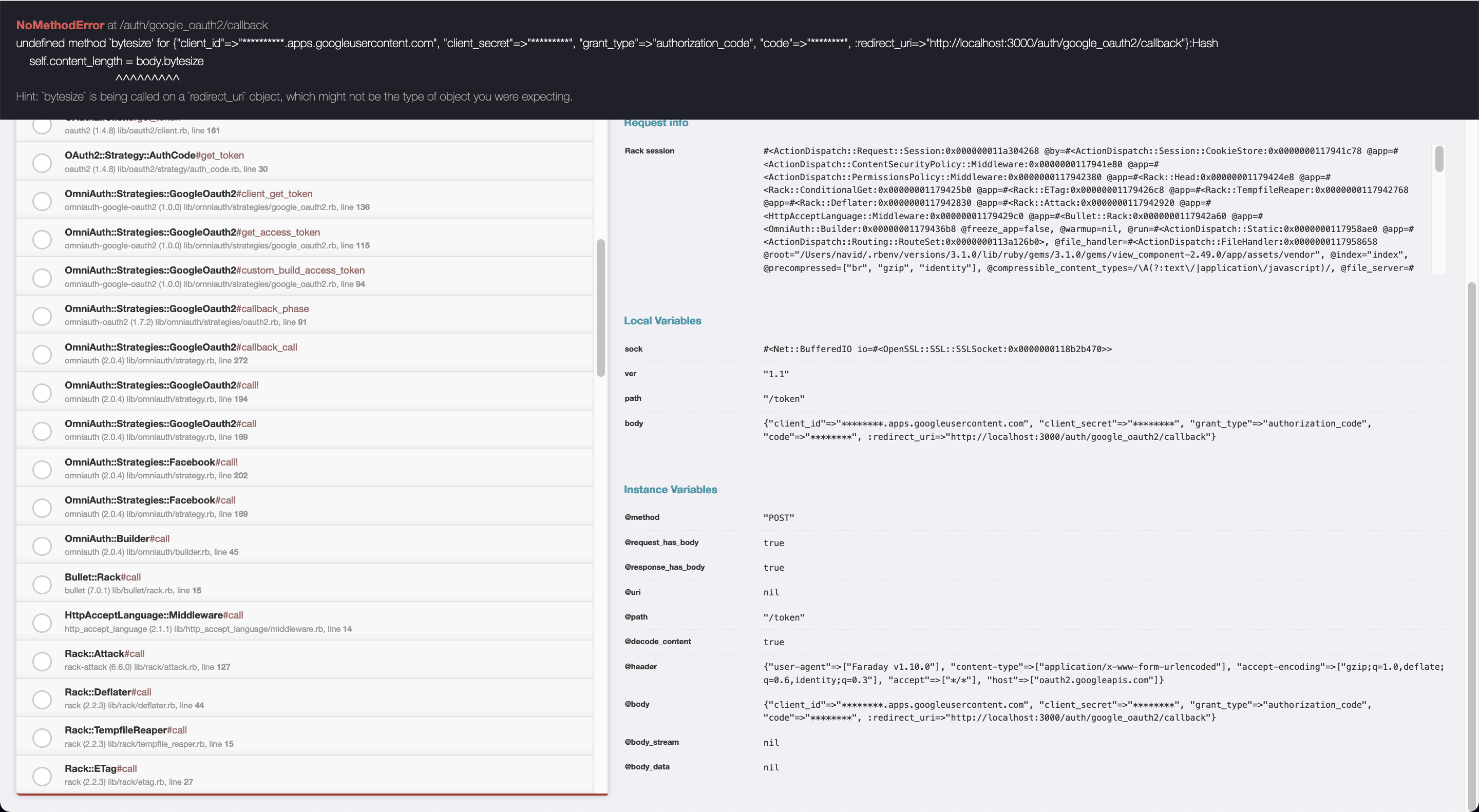 undefined method `bytesize' for {"client_id"=>"**********.apps.googleusercontent.com", "client_secret"=>"*********", "grant_type"=>"authorization_code", "code"=>"********", :redirect_uri=>"http://localhost:3000/auth/google_oauth2/callback"}:Hash