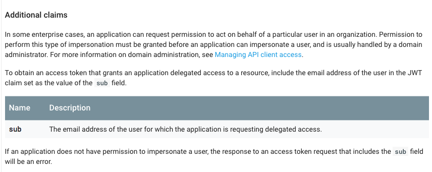 Also, some future paranoia on my part: I believe after reading extensively through too many RFCs that Google's implementation might actually conflict with 7523's requirement of a sub claim. Google uses the presence or lack of a sub claim to detect whether or not you are using your service account to impersonate or act on behalf of a particular user: