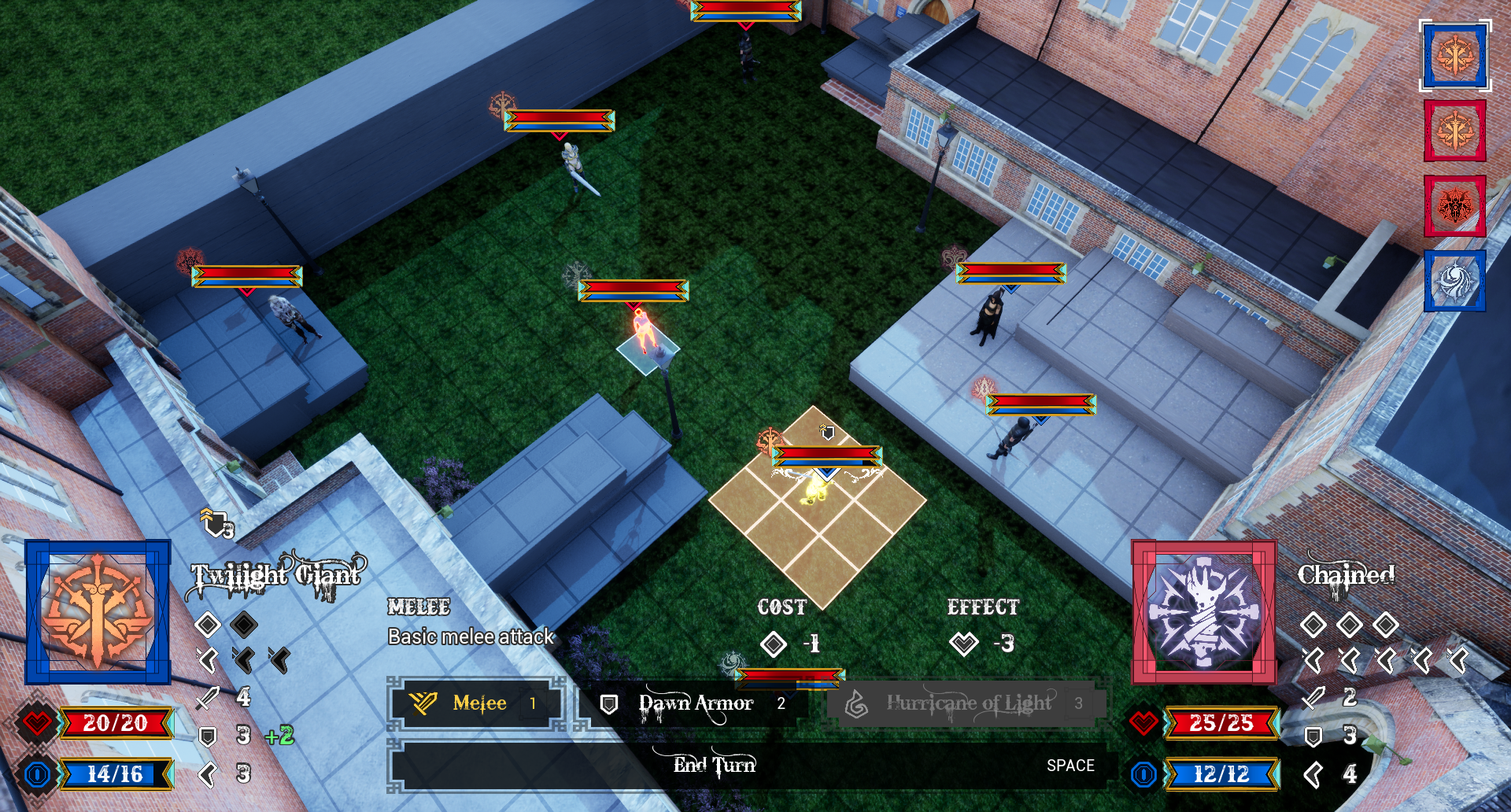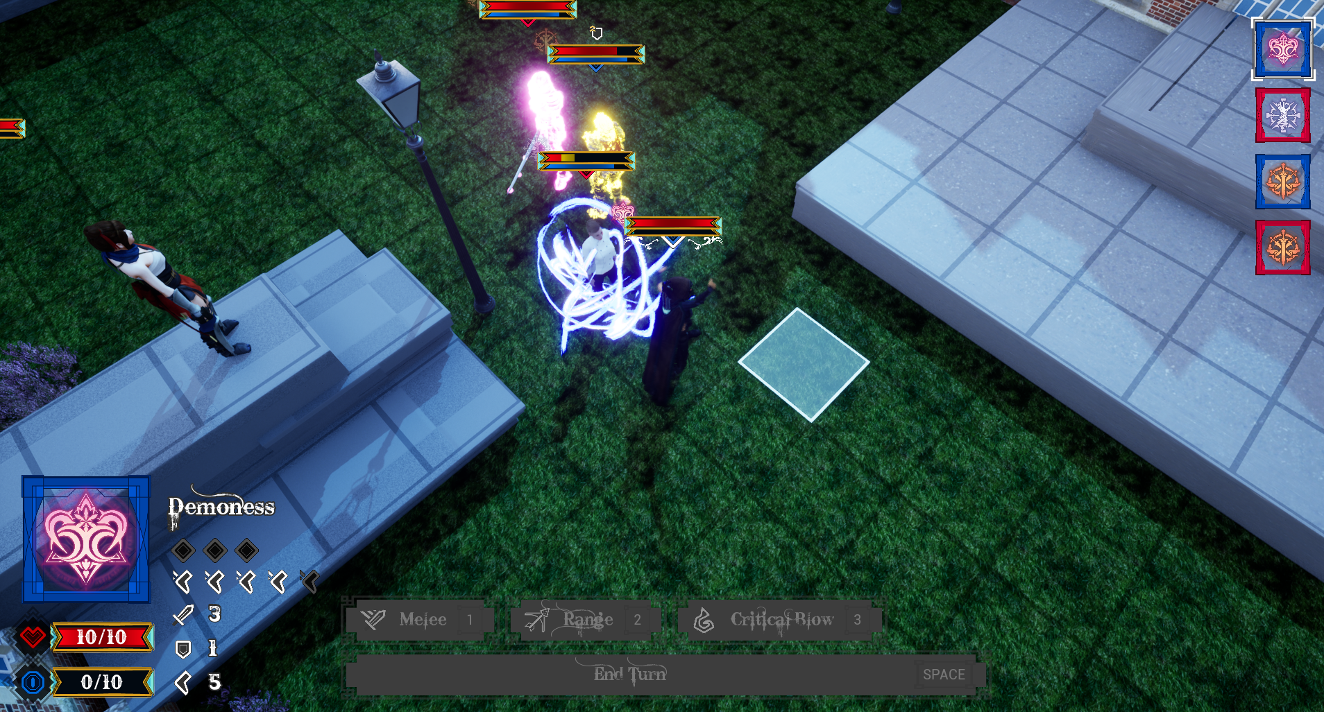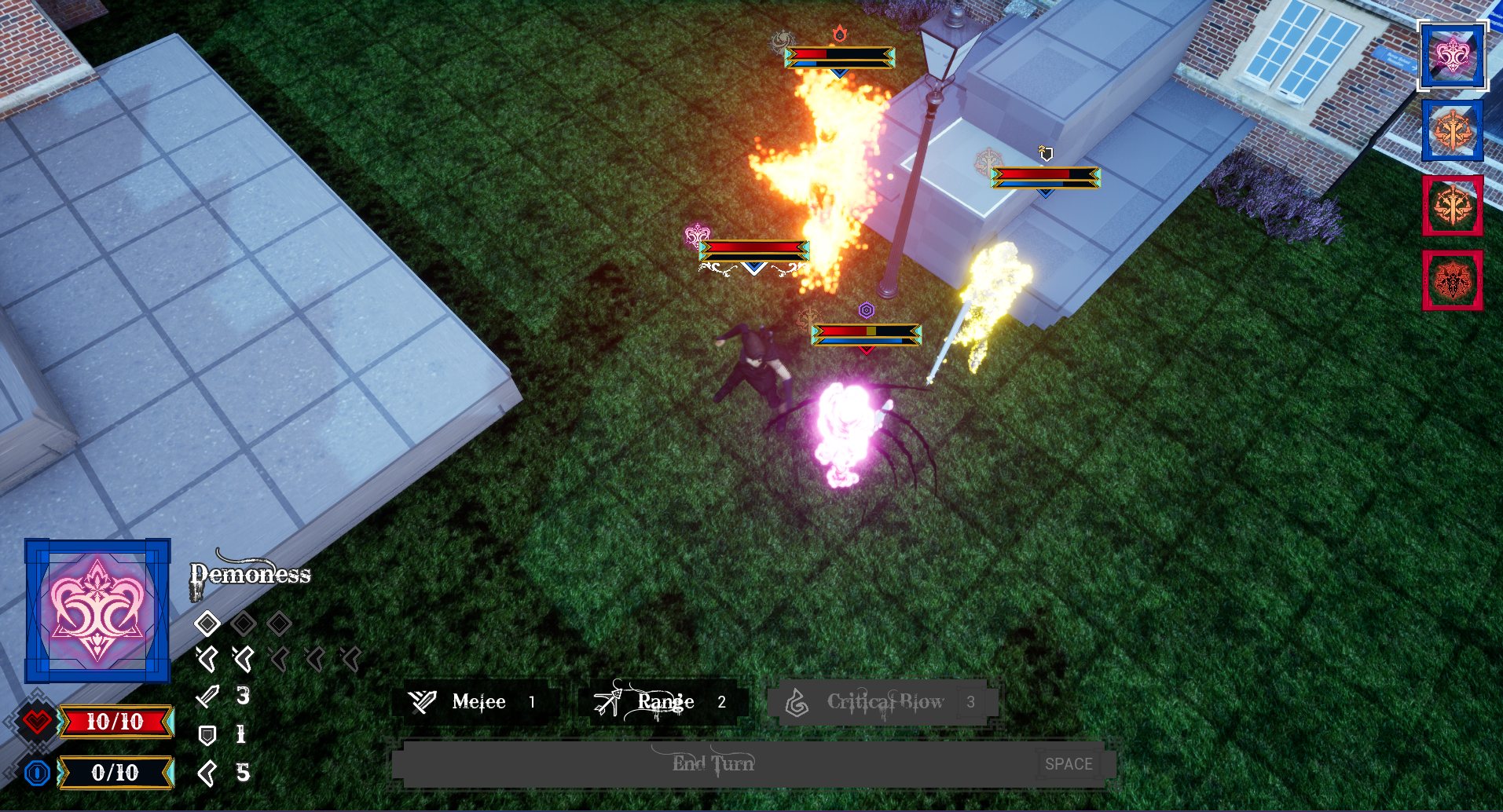 Players are suggested to read through the background and game guide first, then follow the instructions in the tutorial level. After completing tutorial, player are suggested to challenge the Church and Courtyard levels in order. The three default characters (Pyromaniac, Dawn Paladin, and Nightmare) are great choices for your first party.