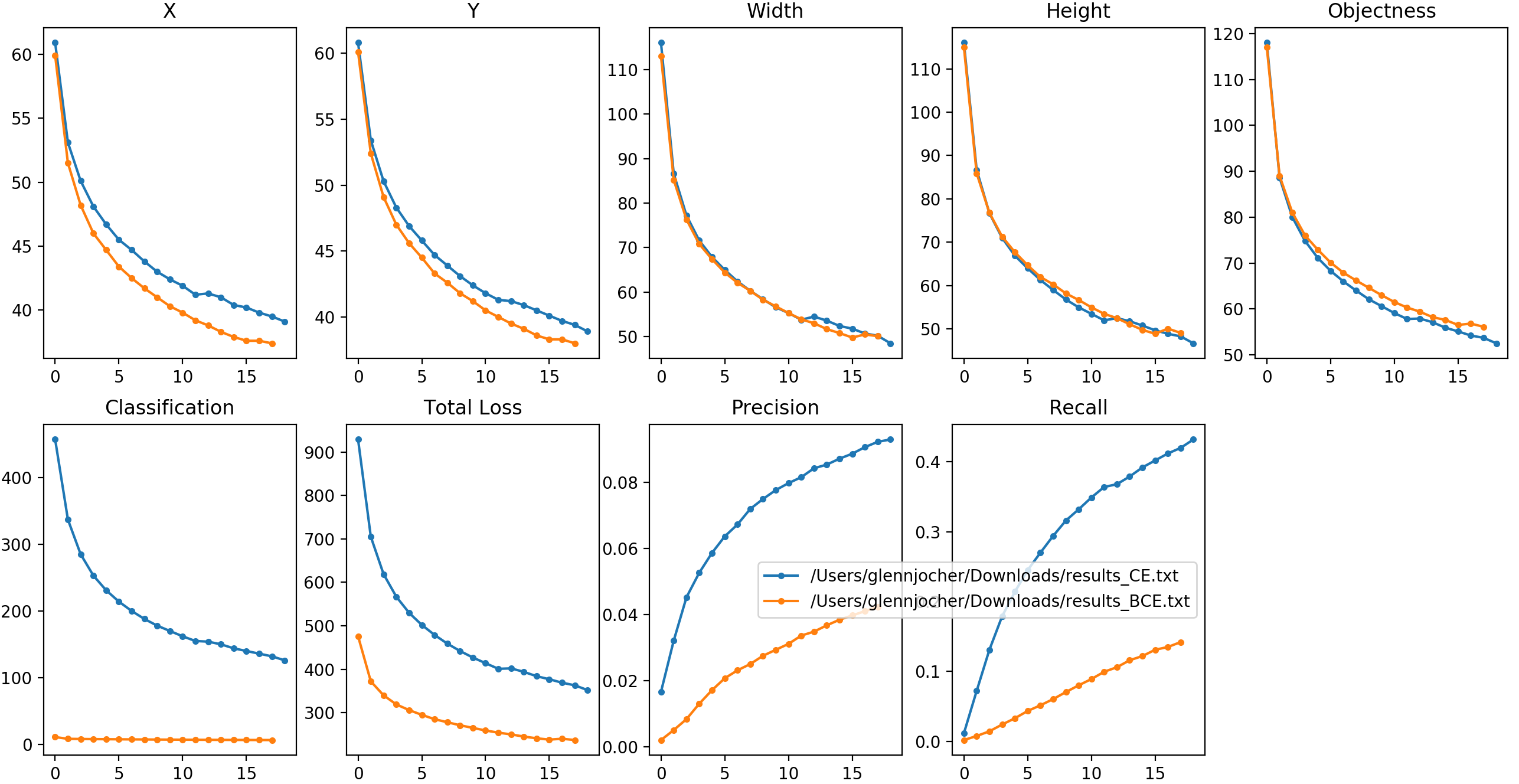 When developing the training code I found that replacing Binary Cross Entropy (BCE) loss with Cross Entropy (CE) loss significantly improves Precision, Recall and mAP. All show about 2X improvements using CE, though the YOLOv3 paper states these loss terms as BCE in darknet.